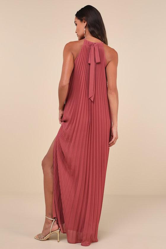 The Lulus Exceptionally Elegant Rusty Rose Pleated Chiffon Maxi Dress is ready for every occasion on your social calendar! Gauzy pleated woven chiffon creates a high halter neckline that ties at back, a sleeveless silhouette, and a shift-style bodice that continue down through the slit maxi hem.