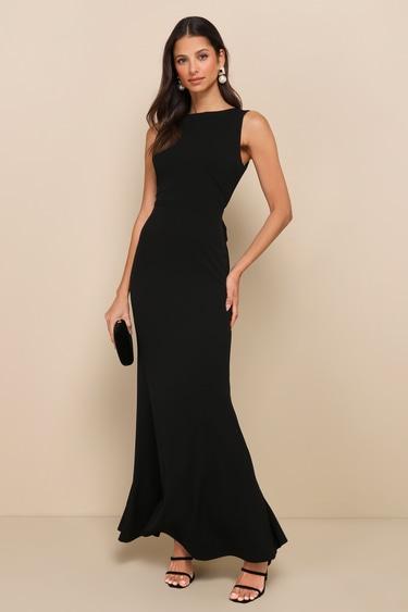 The Lulus Exquisite Refinement Black Backless Bow Ruffled Maxi Dress is a luxurious design that made to ensure that all eyes are on you when you step into the room! You'll look fabulous all night long with this stretchy crepe knit dress that features a sophisticated boat-style neckline and a sleeveless bodice with an alluring open-back design. The fitted waist tops a figure-flaunting, mermaid-style skirt that falls to a sweeping maxi hem. A trendy bow detail and cascading ruffles accent the back of the skirt for a gorgeous finish!