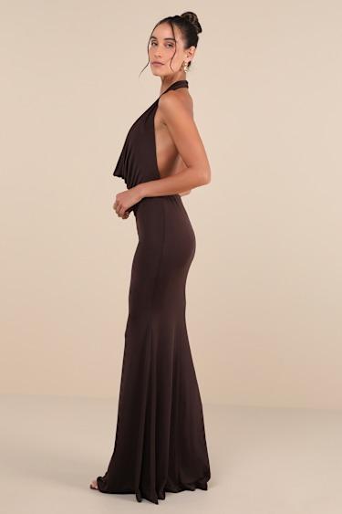 Everyone's attention will be on you and the way you move in the Lulus Eye-Catching Silhouette Dark Brown Cowl Neck Halter Maxi Dress! Slinky, stretchy jersey knit shapes this jaw-dropping dress with a halter neckline and a plunging cowl bodice. The figure-flattering silhouette falls to a mermaid skirt with an elegant maxi hem. Dual, covered top button closures secure atop the sexy open back design. Elastic at back for fit.