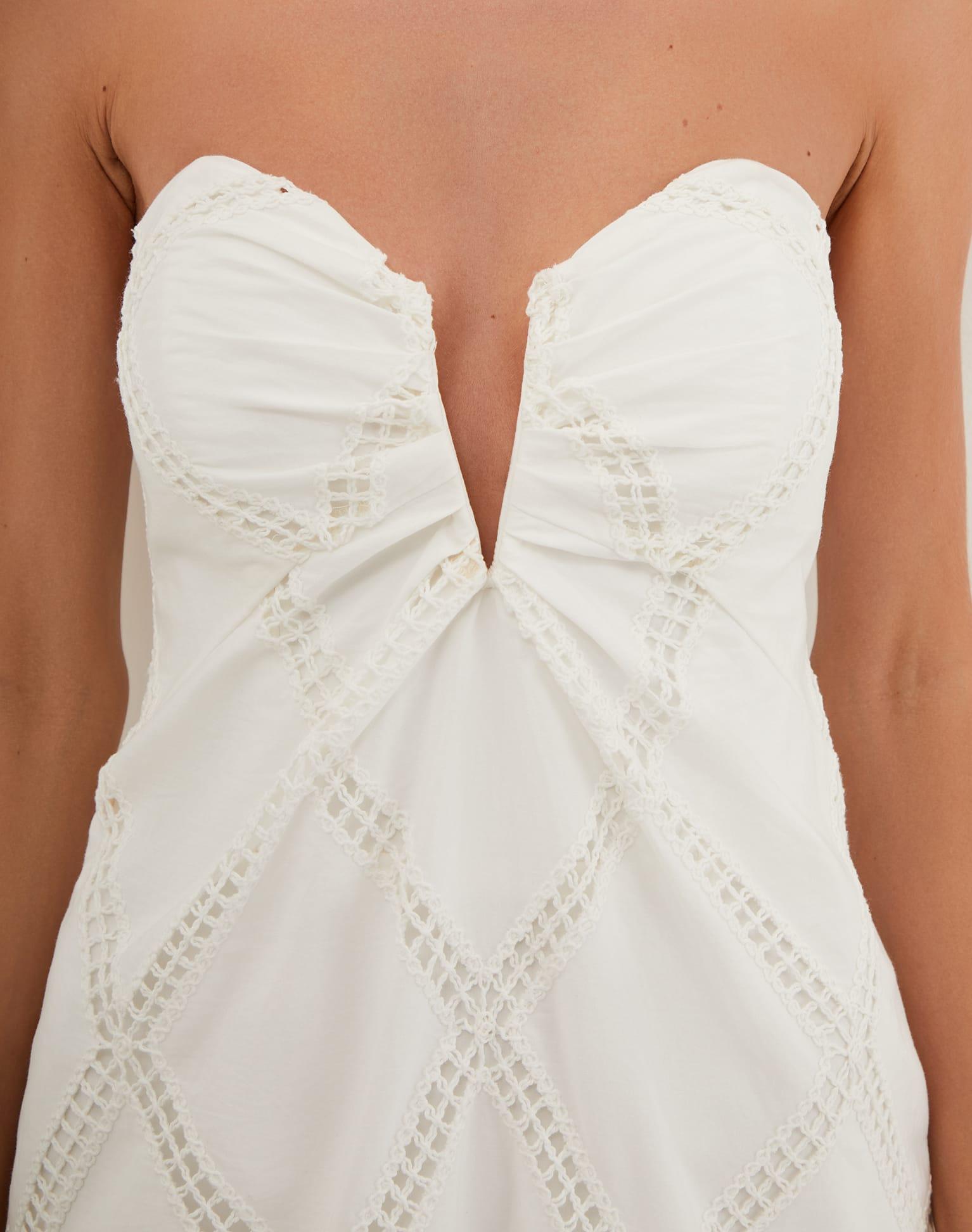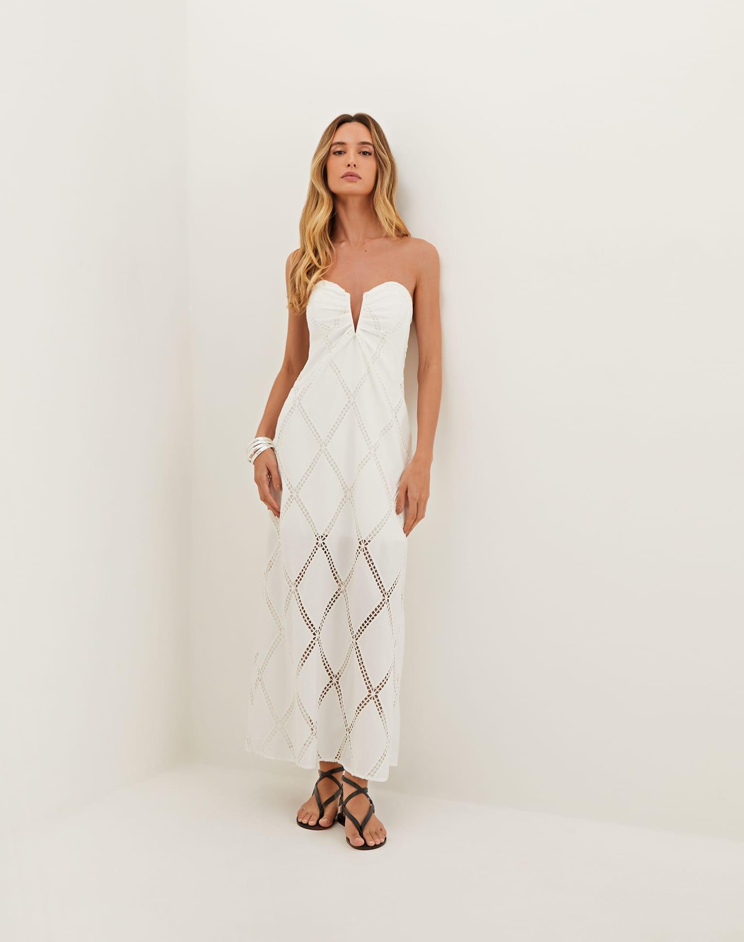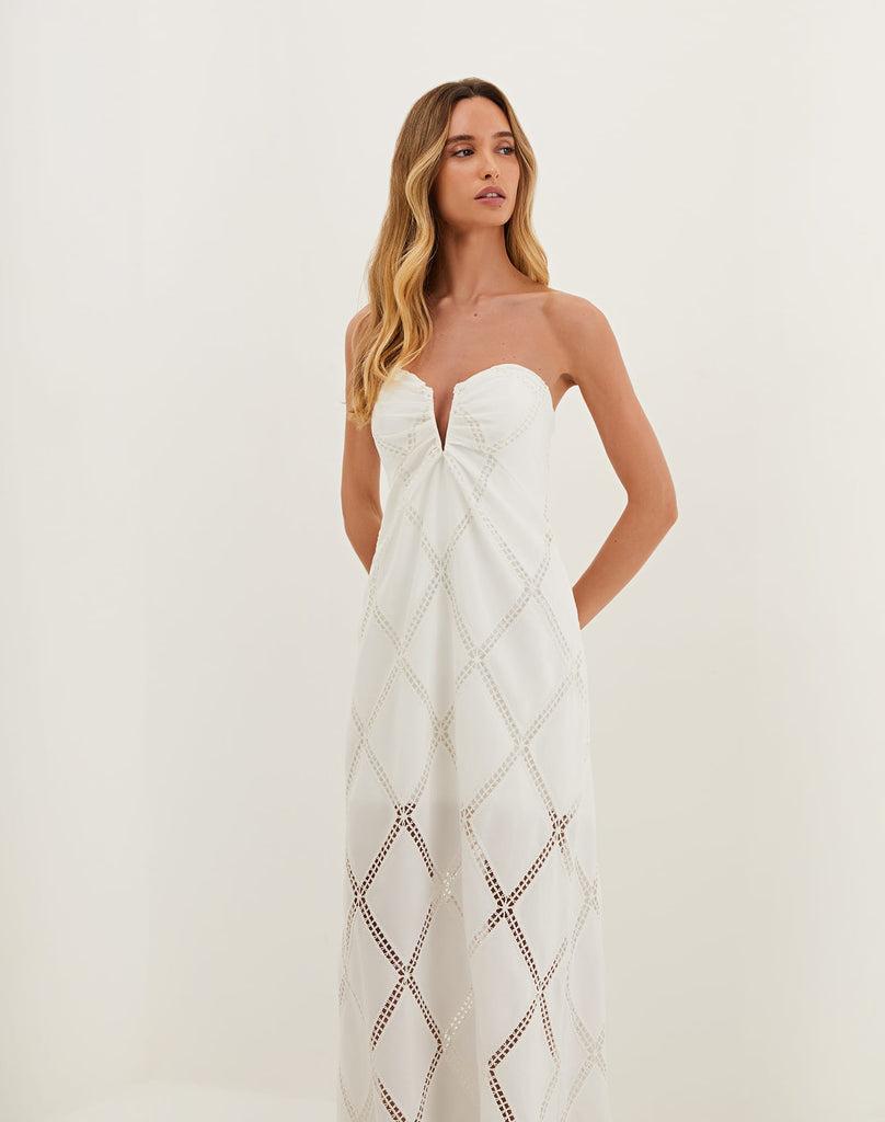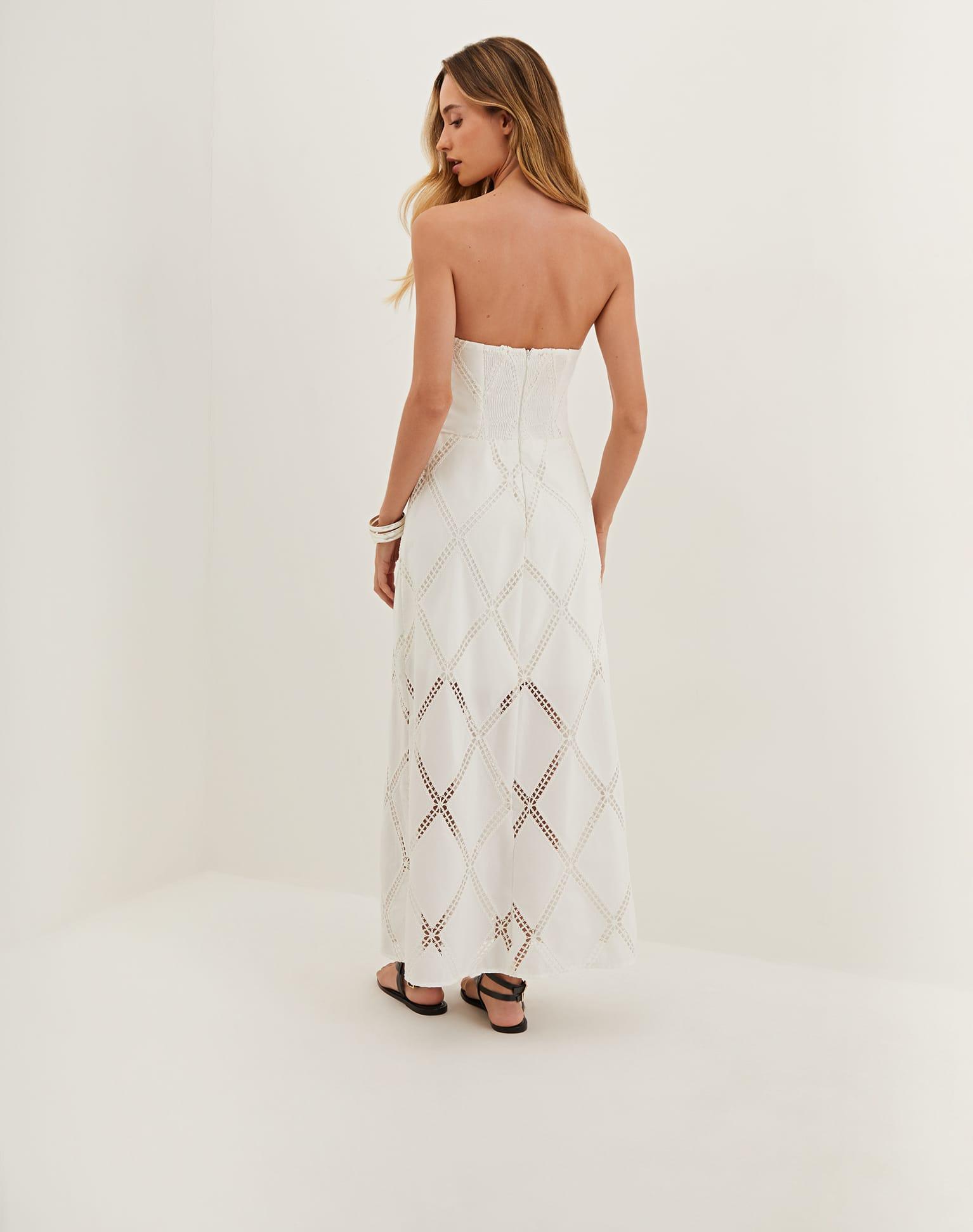 The ViX Eyelet Zhen Long Dress is a strapless maxi featuring a sweetheart neckline with a built-in underwire for a flattering lift, a subtle dip at the bust, a smocked back for added comfort, and a concealed back zip closure. Style the Zhen Long Dress with sandals and ViX accessories for a resort-ready look. Features: