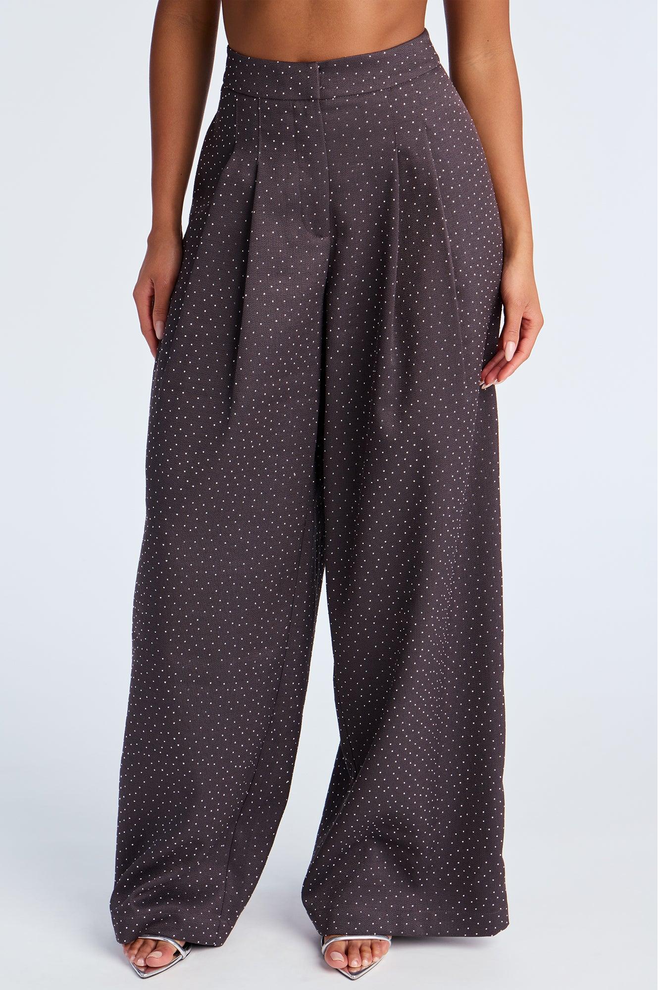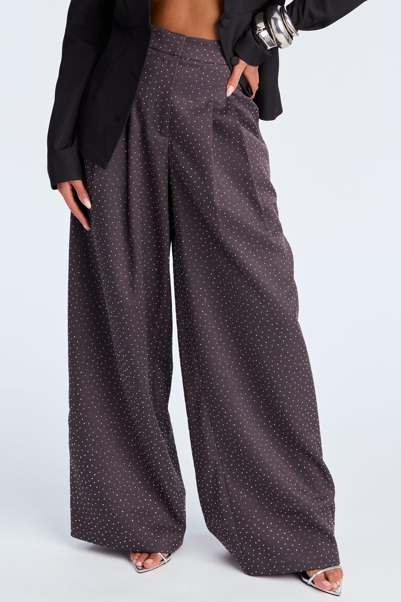 Available In Charcoal, Ivory And Wine. Wide Leg Pant Hook And Eye Closure High Rise Twill 32" Inseam Rhinestone Detail Non Stretch Self : 97% Polyester 3% Spandex Lining : 100% Cotton Imported California Proposition 65WARNING: Cancer and Reproductive Harm - www.P65Warnings.ca.gov.