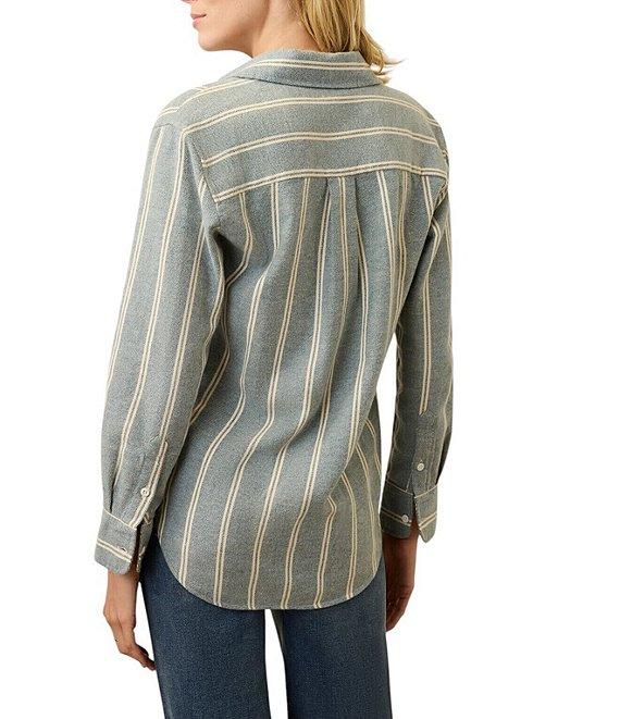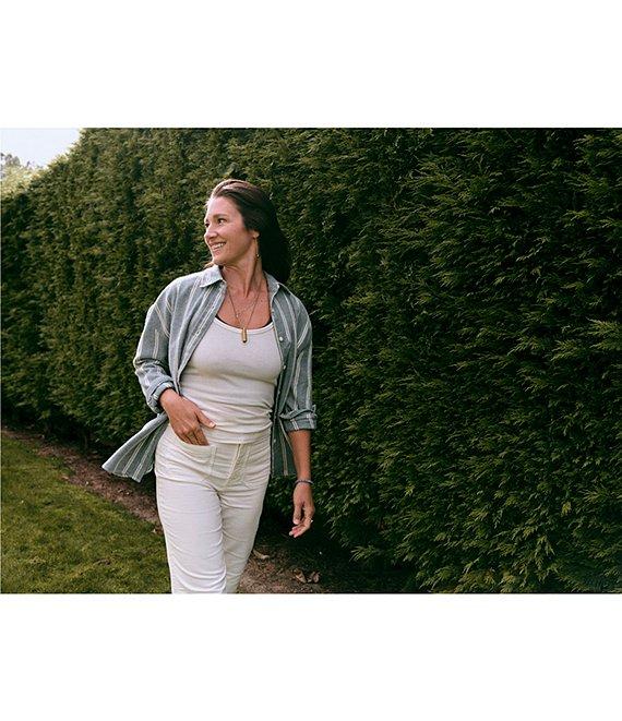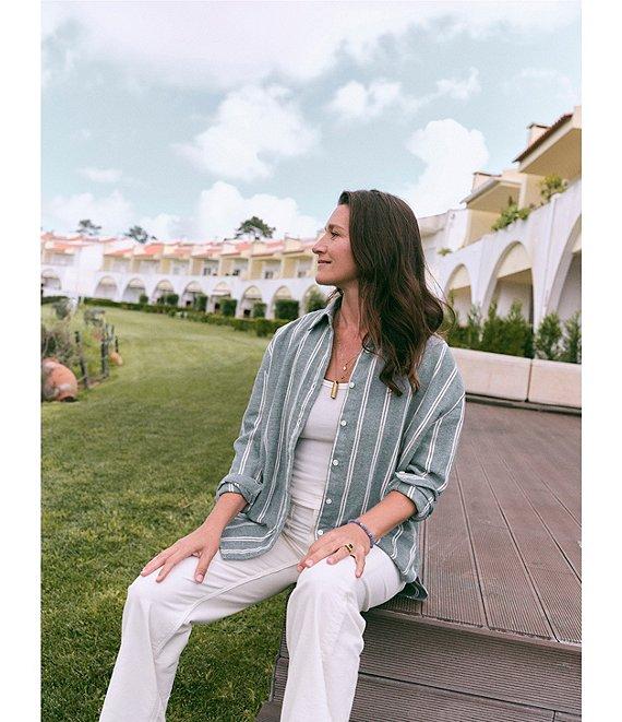 From Faherty, this shirt features: Knit fabrication Button down collar Long sleeves Vertical stripe print Button front closure Approx. 26" in length Organic cotton Turn inside out before machine washing on a cold and gentle cycle with like colors. Do not bleach. Tumble dry low and remove promptly. Use a cool iron when needed. Imported.