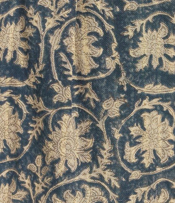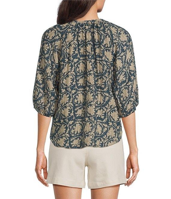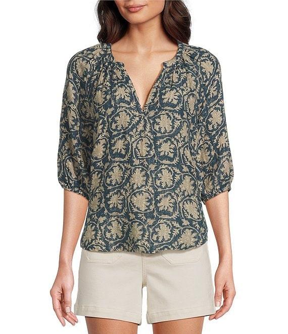 Faherty Seacliff Print Organic Cotton Shirring Split V-Neckline 3/4 Sleeve Top