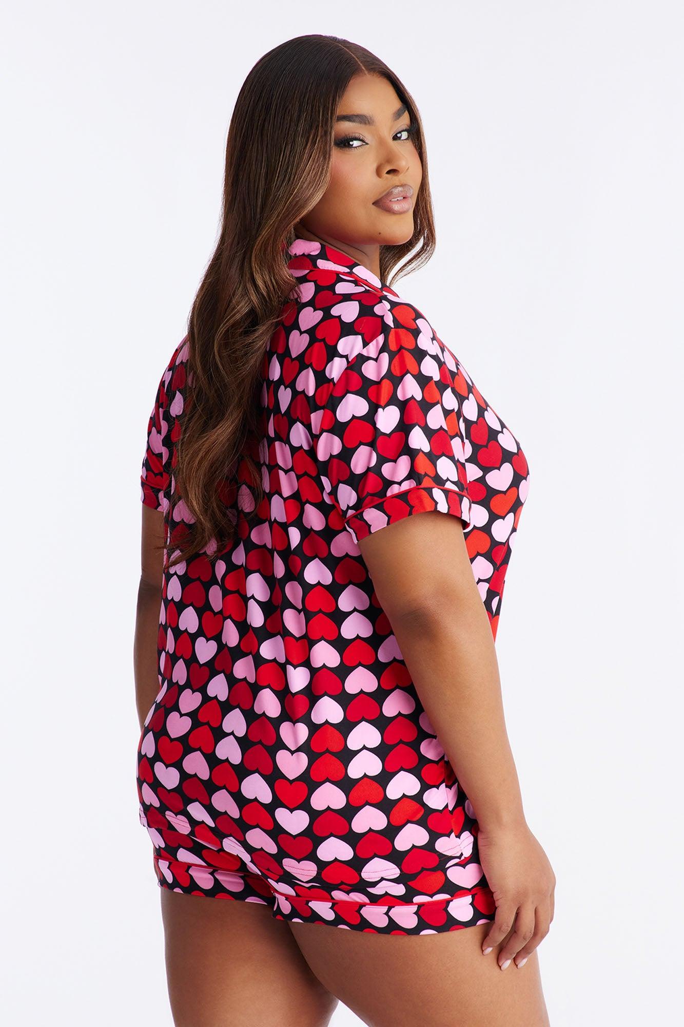 Available In Red/combo. PJ Short Set Heart Print Short Sleeve Button Up Shirt Collar Chest Pocket Matching Short Elastic Waistband Bow Stretch Final Sale Disclaimer: Print Placement May Vary. 95% Polyester 5% Spandex Imported