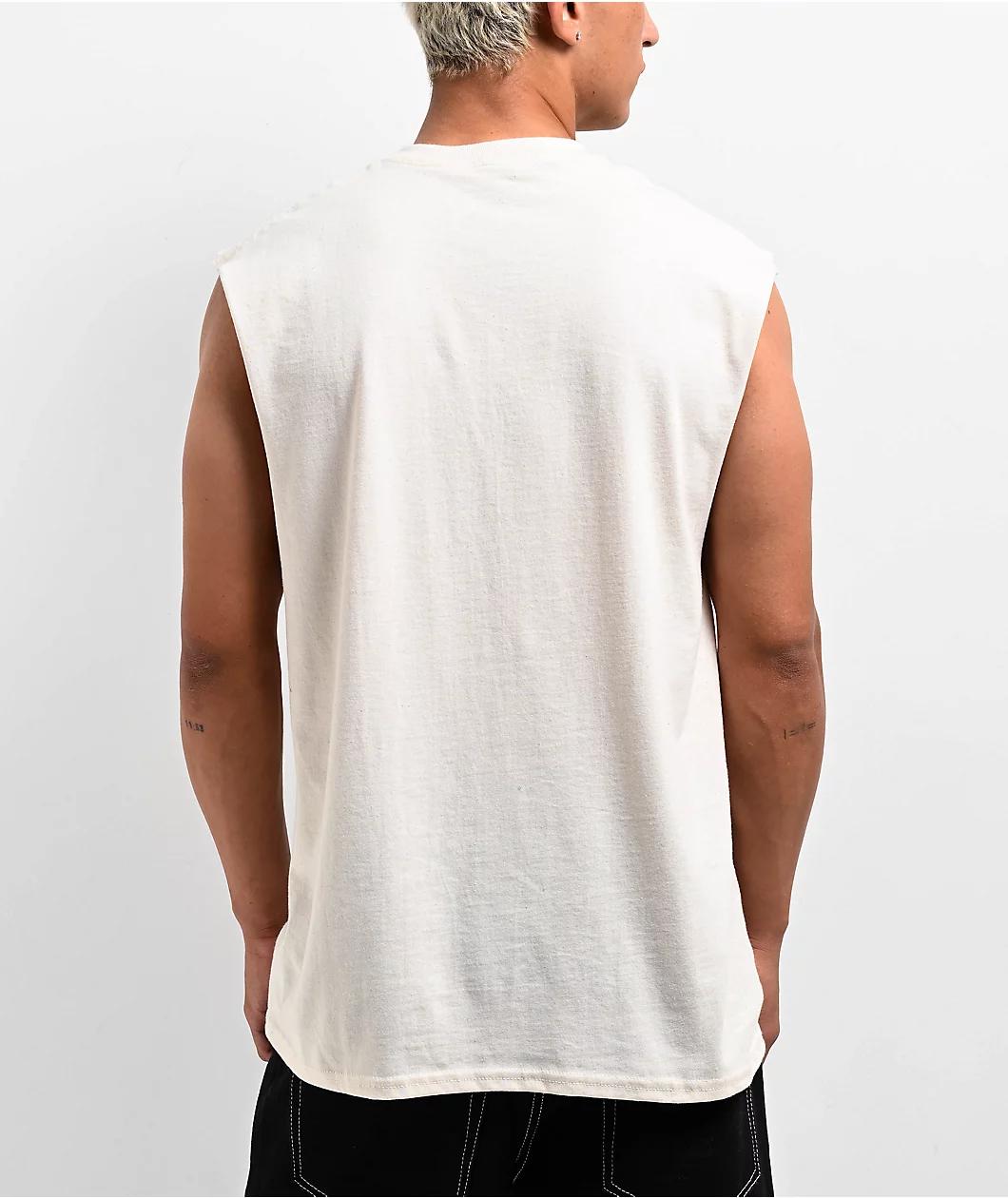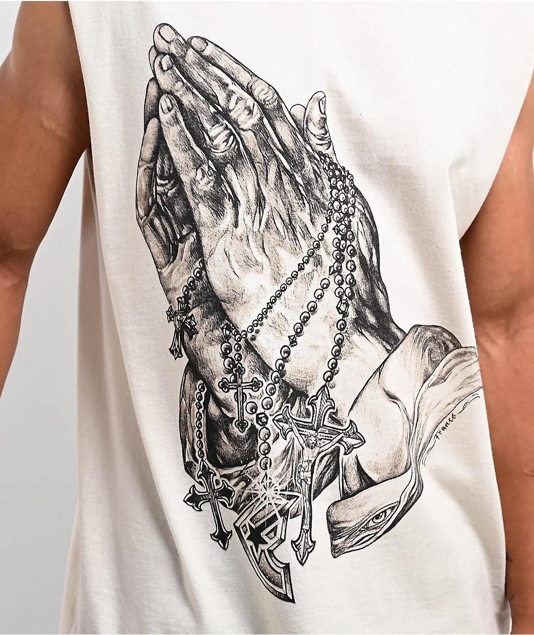 Enjoy a classic sleeveless tank top with the Praying Hands muscle shirt from Famous Stars and Straps, fashion brand founded by popular drummer Travis Barker. The beige shirt features a large front graphic of a pair of hands praying with a Rosary, fro