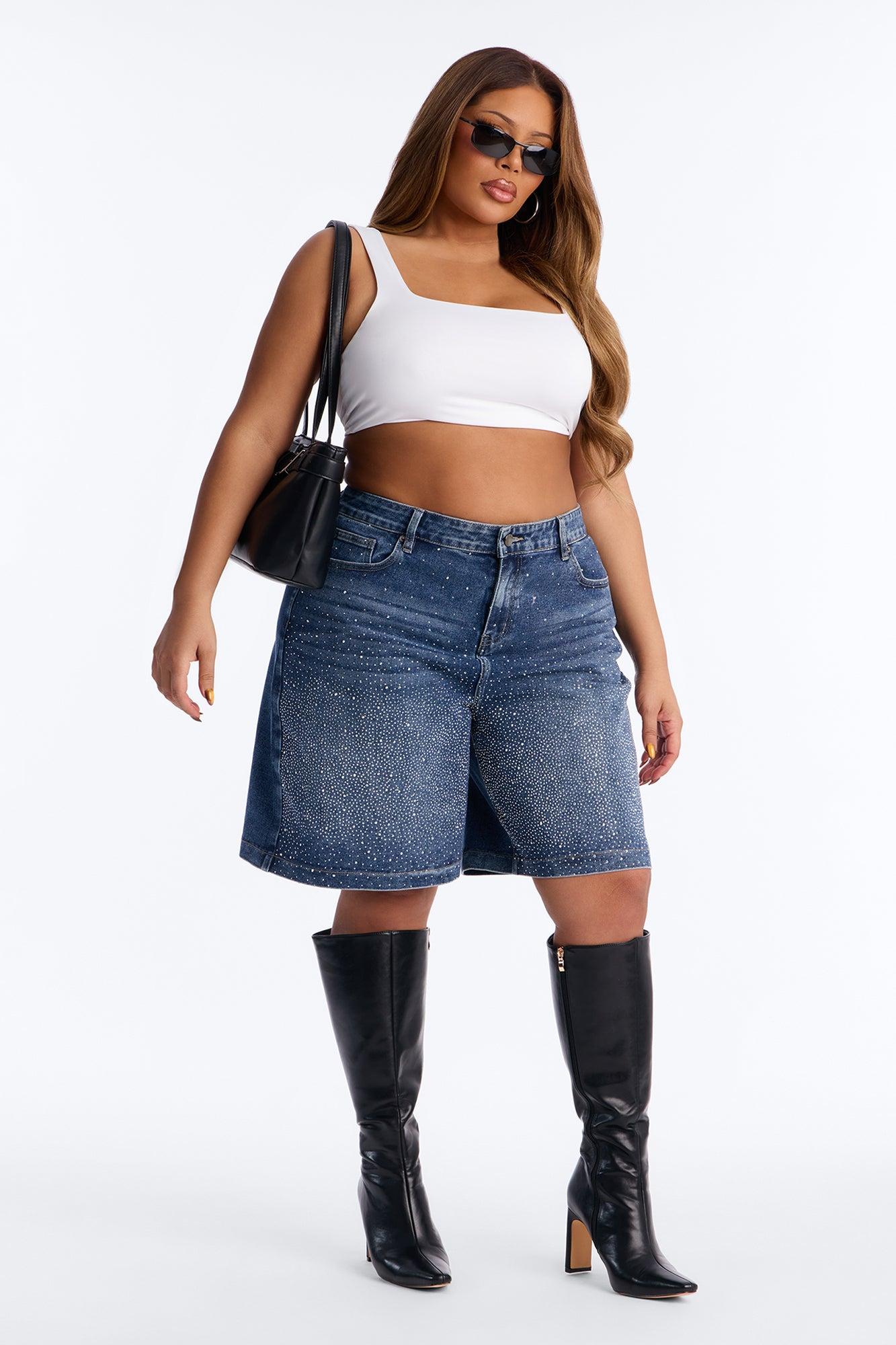 Available In Dark Wash. 5 Pocket Denim Short Embellishment 11.5" Rise 9.5" Inseam Low Stretch Disclaimer: Due To The Rhinestones Process, Each Garment Is Unique & fall out may happen. Shell: 70% Cotton 29% Polyester 1% Spandex Imported
