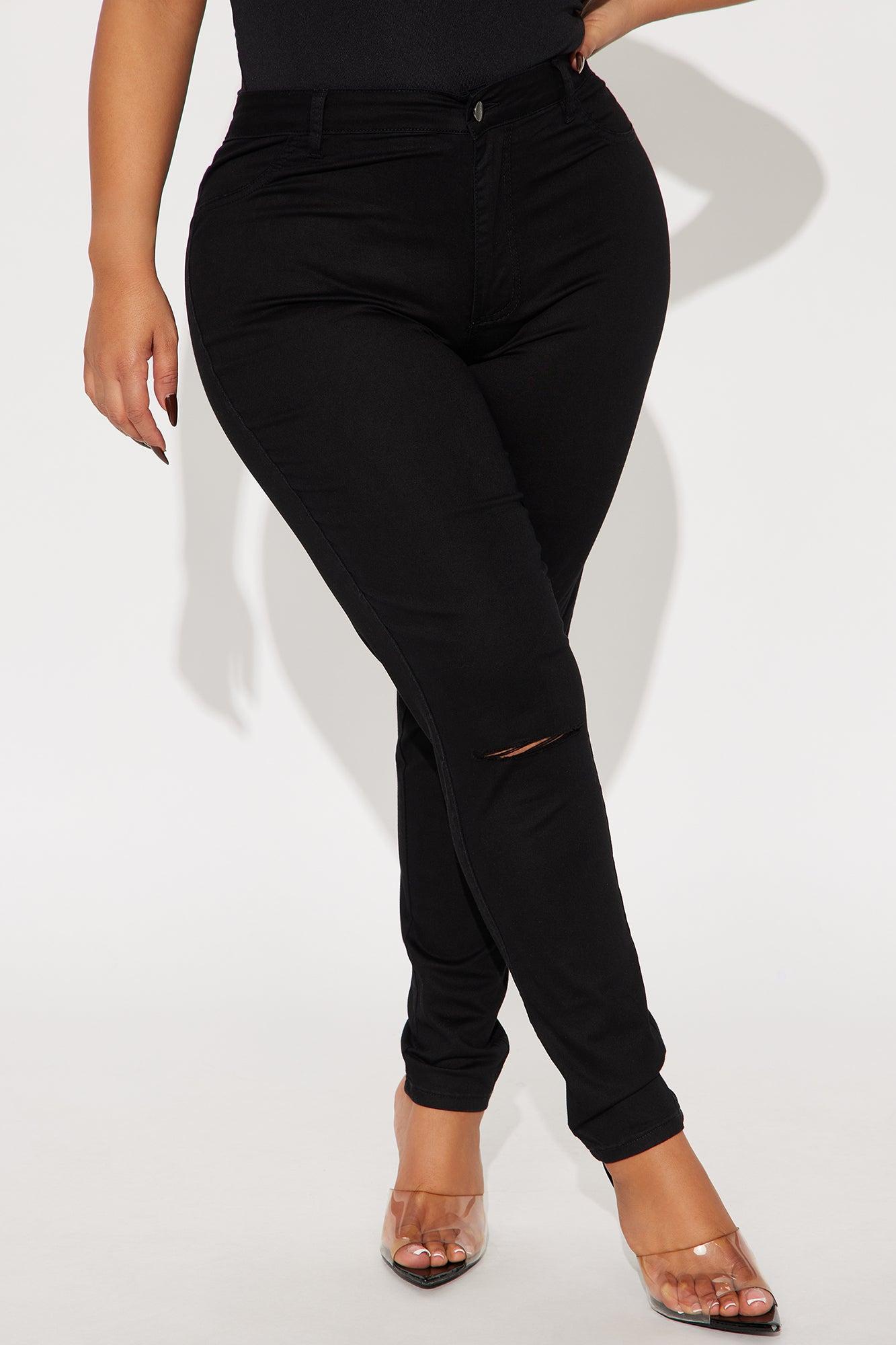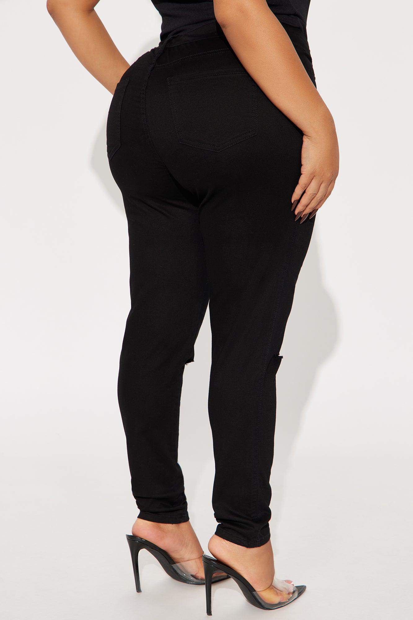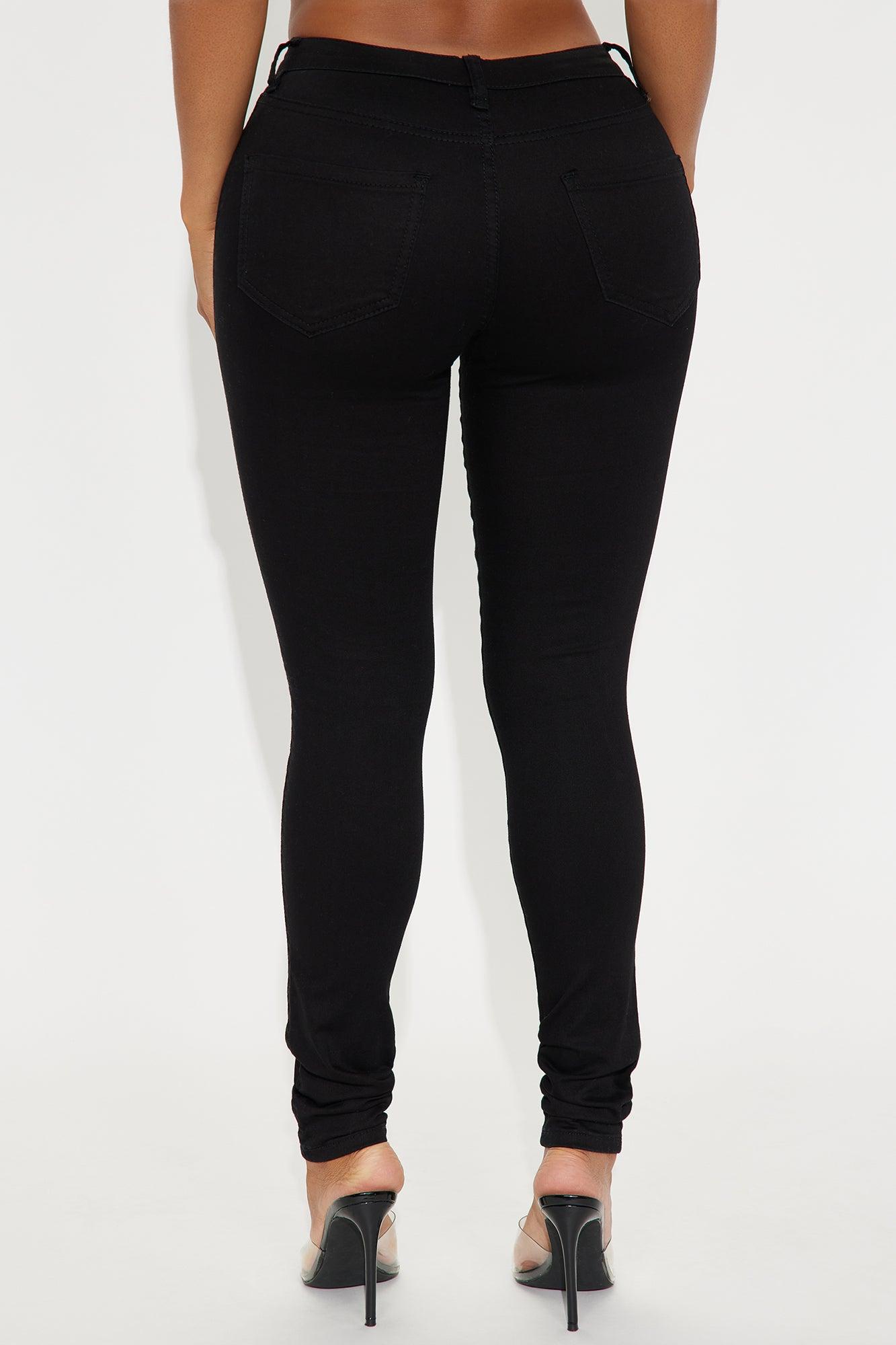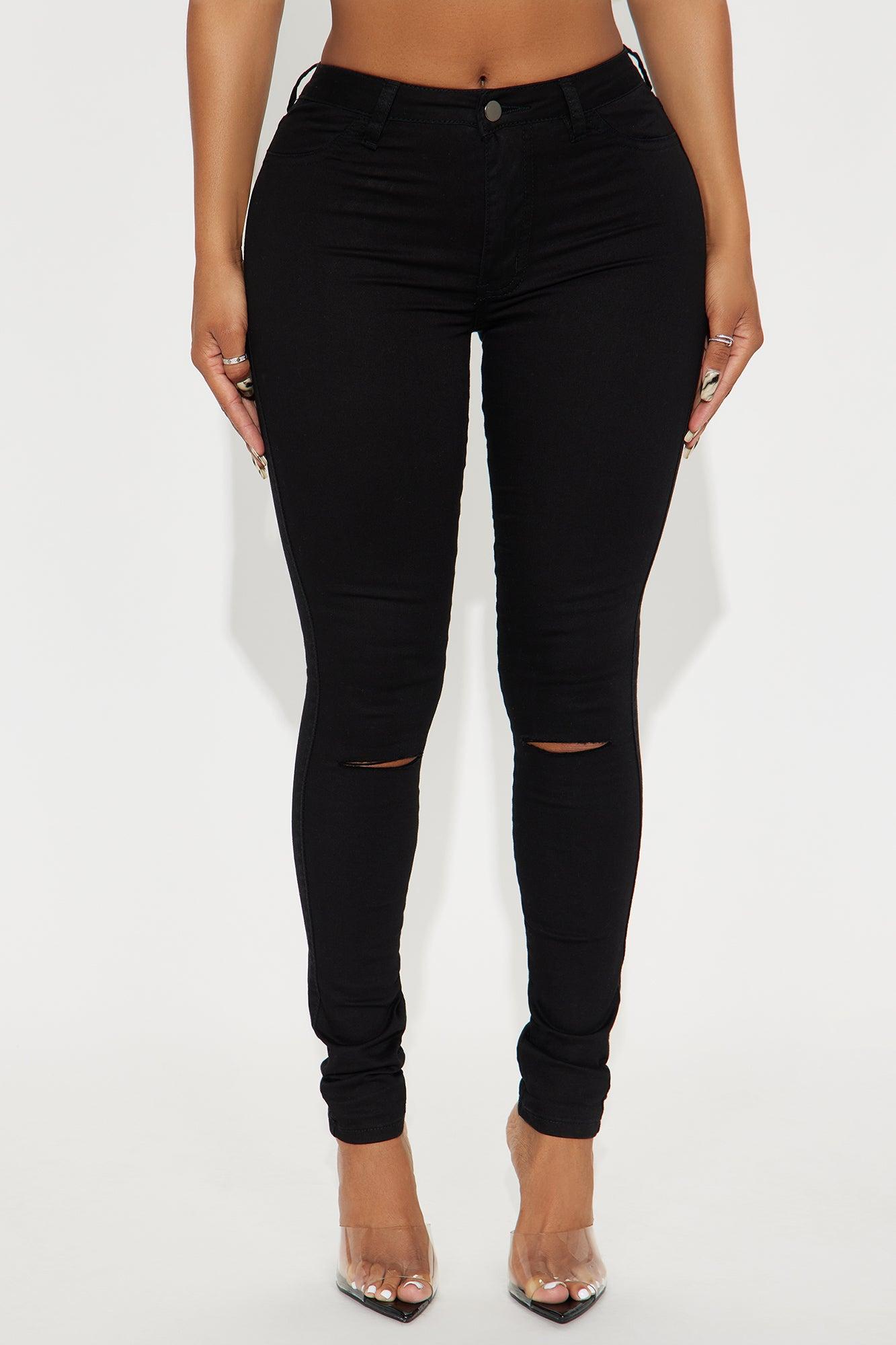 Available In Black. Run Small, Order a Size Up Skinny Jean High Stretch Slit Knee Functional Back Pockets 9.5" Mid Rise 30" Inseam Disclaimer: Due To The Specialized Distressing Process, Each Garment Is Unique. 97% Cotton 3% Spandex Imported California Proposition 65WARNING: Cancer and Reproductive Harm - www.P65Warnings.ca.gov.
