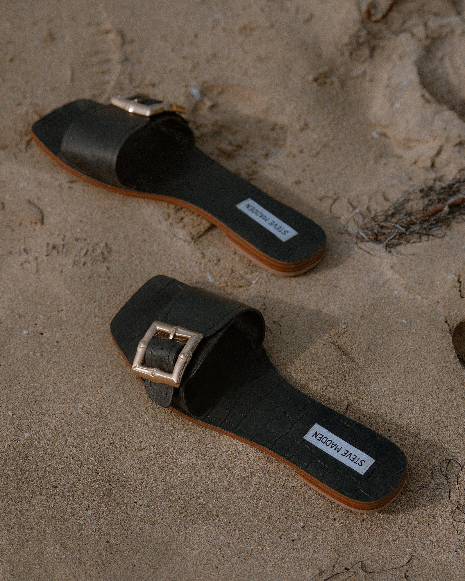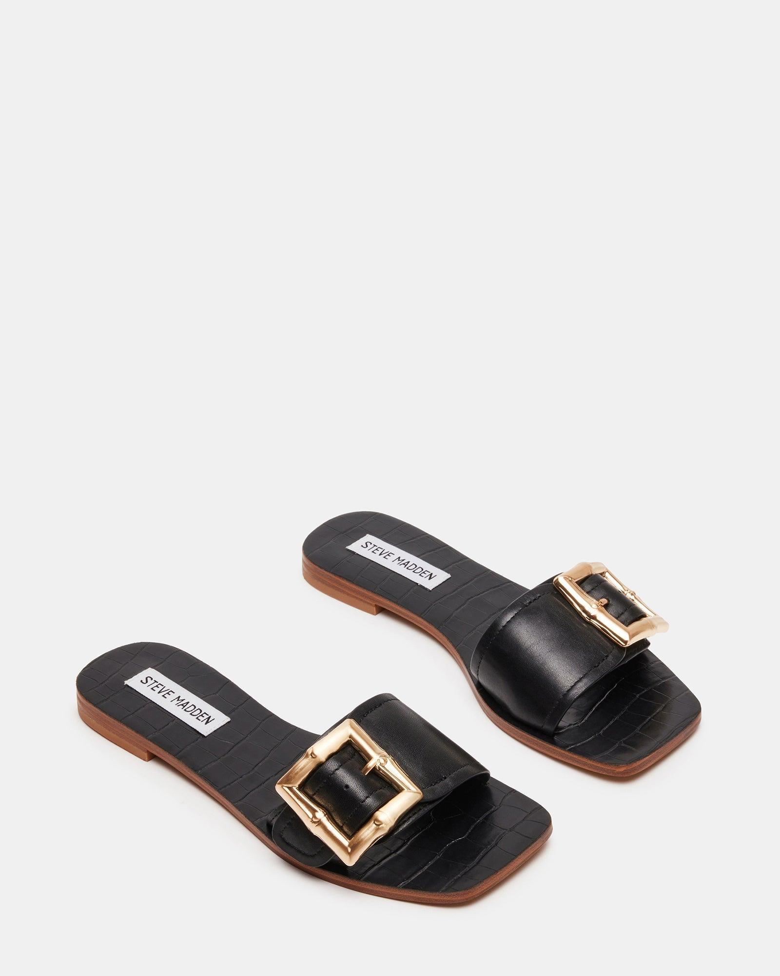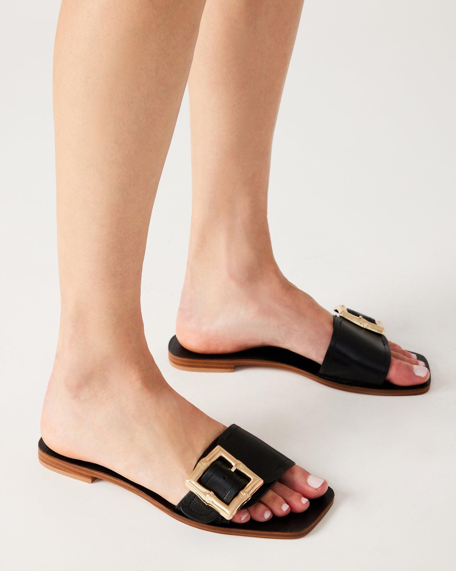 POLISHED + BREEZY + SMARTOversized square buckle hardware accents the slide strap of the FARRAH sandal, securing this design to its comfortable flat square toe sole. Flat square toe slide sandal Slip-on style Adjustable slide strap with oversize square buckle hardware .5 inch heel height Leather upper material with hardware Synthetic lining Synthetic sock Synthetic sole Imported