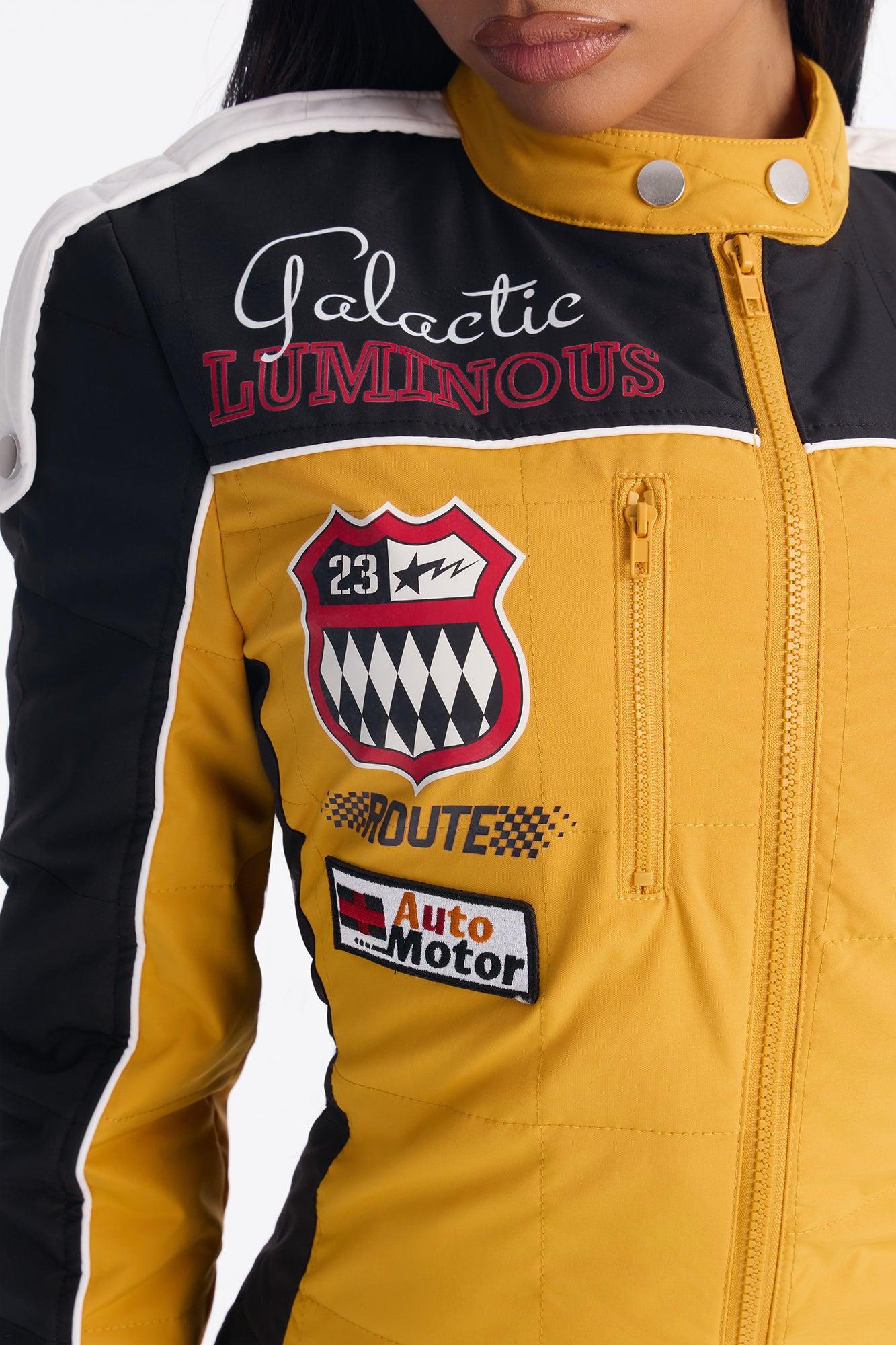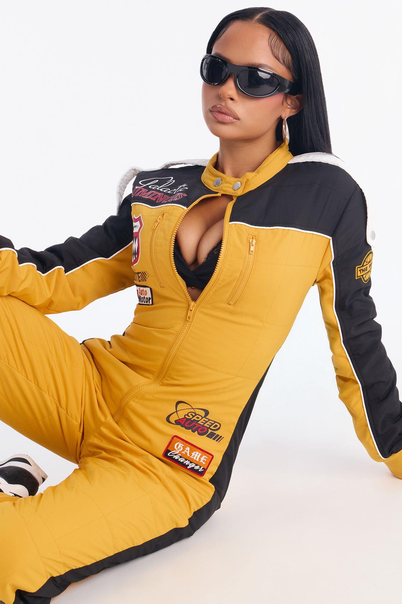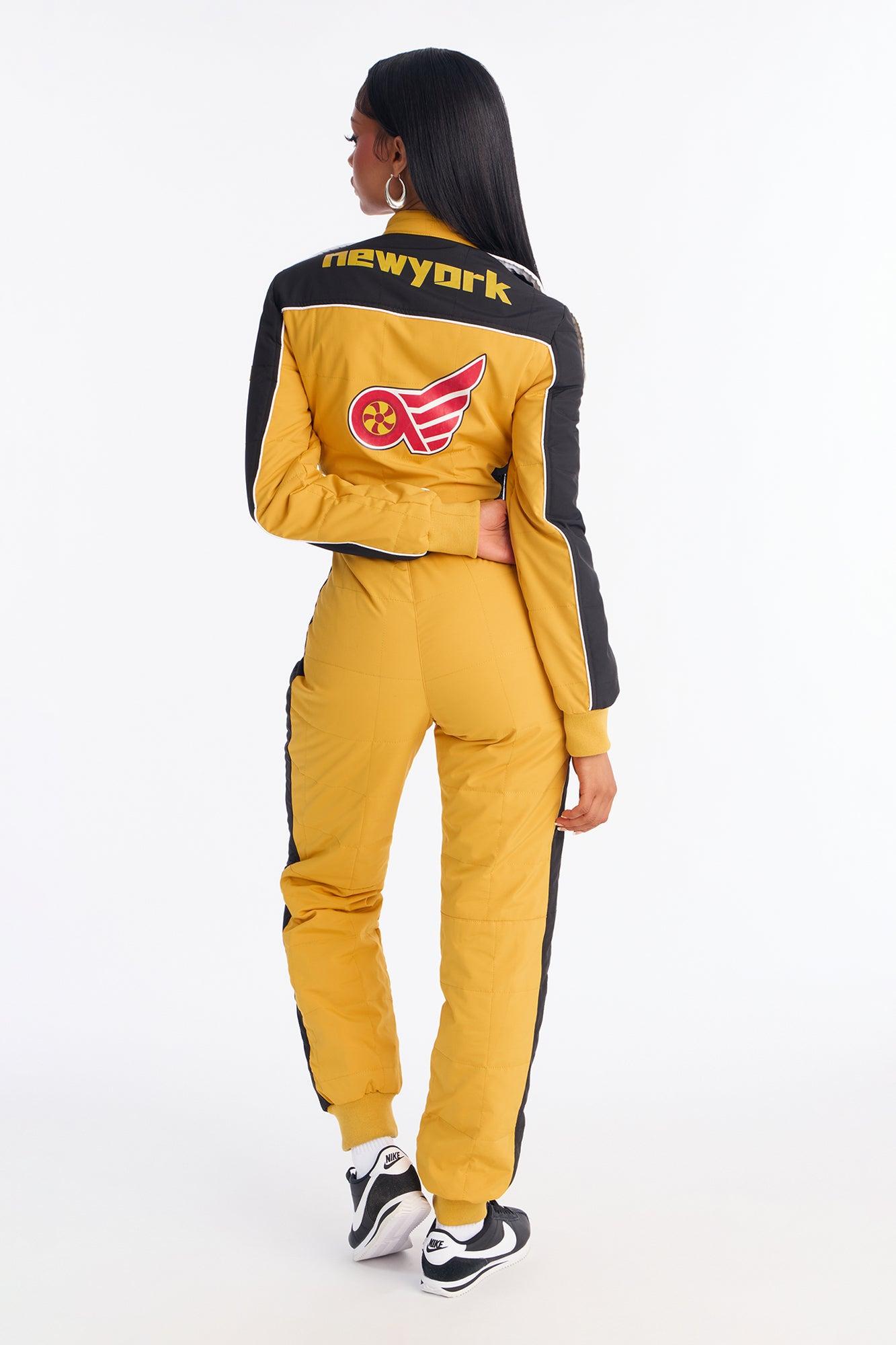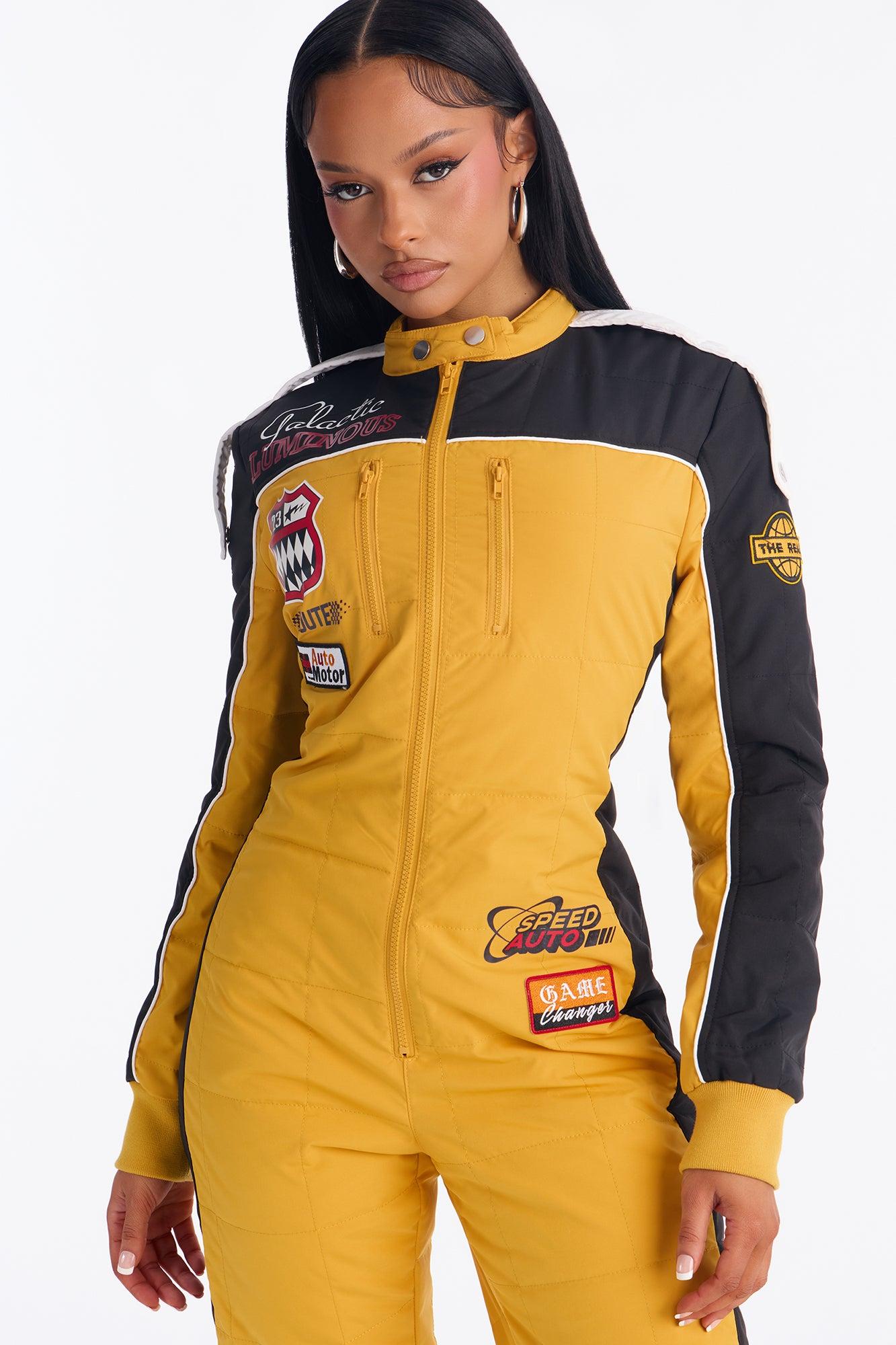 Available In Yellow. Jumpsuit Non-stretch Long Sleeve Mock neck Zipper Front Closure Straight Leg Jogger 31.5" Inseam Self: 100% Polyester Lining: 100% Polyester Filling: 100% Polyester Rib: 98% Polyester 2% Spandex Imported California Proposition 65WARNING: Cancer and Reproductive Harm - www.P65Warnings.ca.gov.