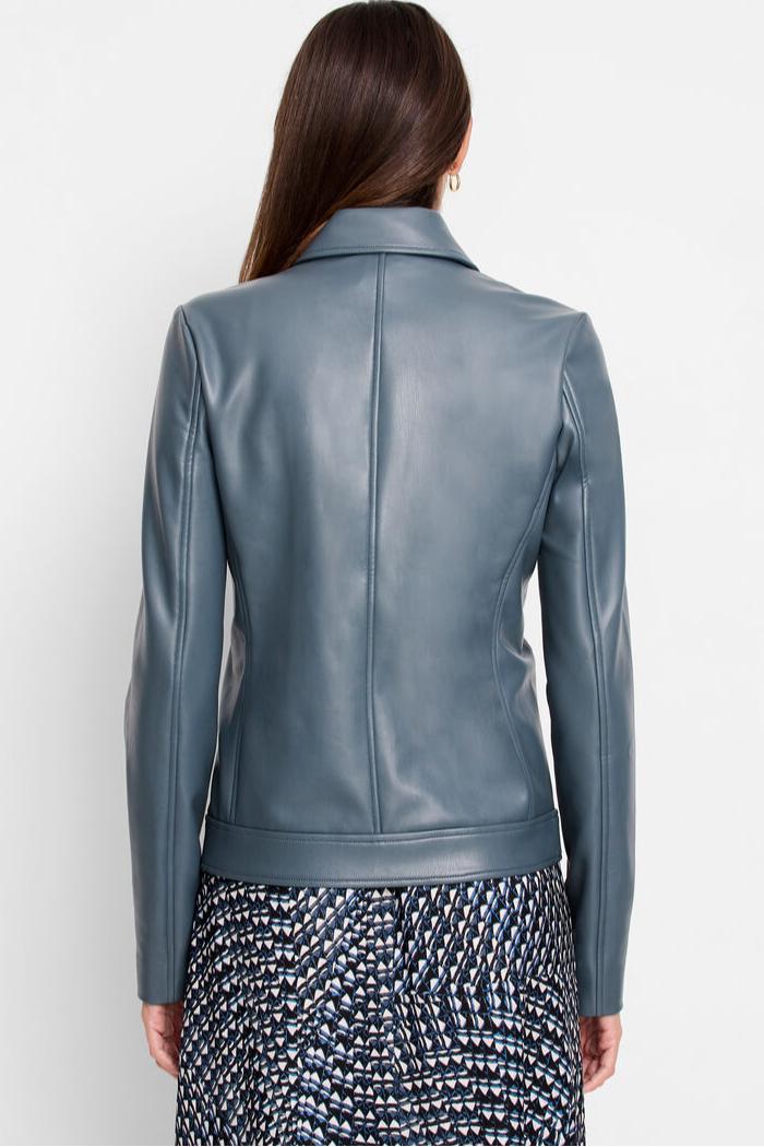 Urban edge meets timeless sophistication. Over a dress or with jeans and a tee, this updated leather jacket silhouette is our can't-miss layer of the season. In an adaptable and alluring gray-green we call Patina, it's sure to stand out from all the other layers. Made from vegan leather with a fleecy back in a sleek silhouette that falls to hip, she features an easy zip closure, classic collar, and functional flap pockets for stowing life's little go-withs.