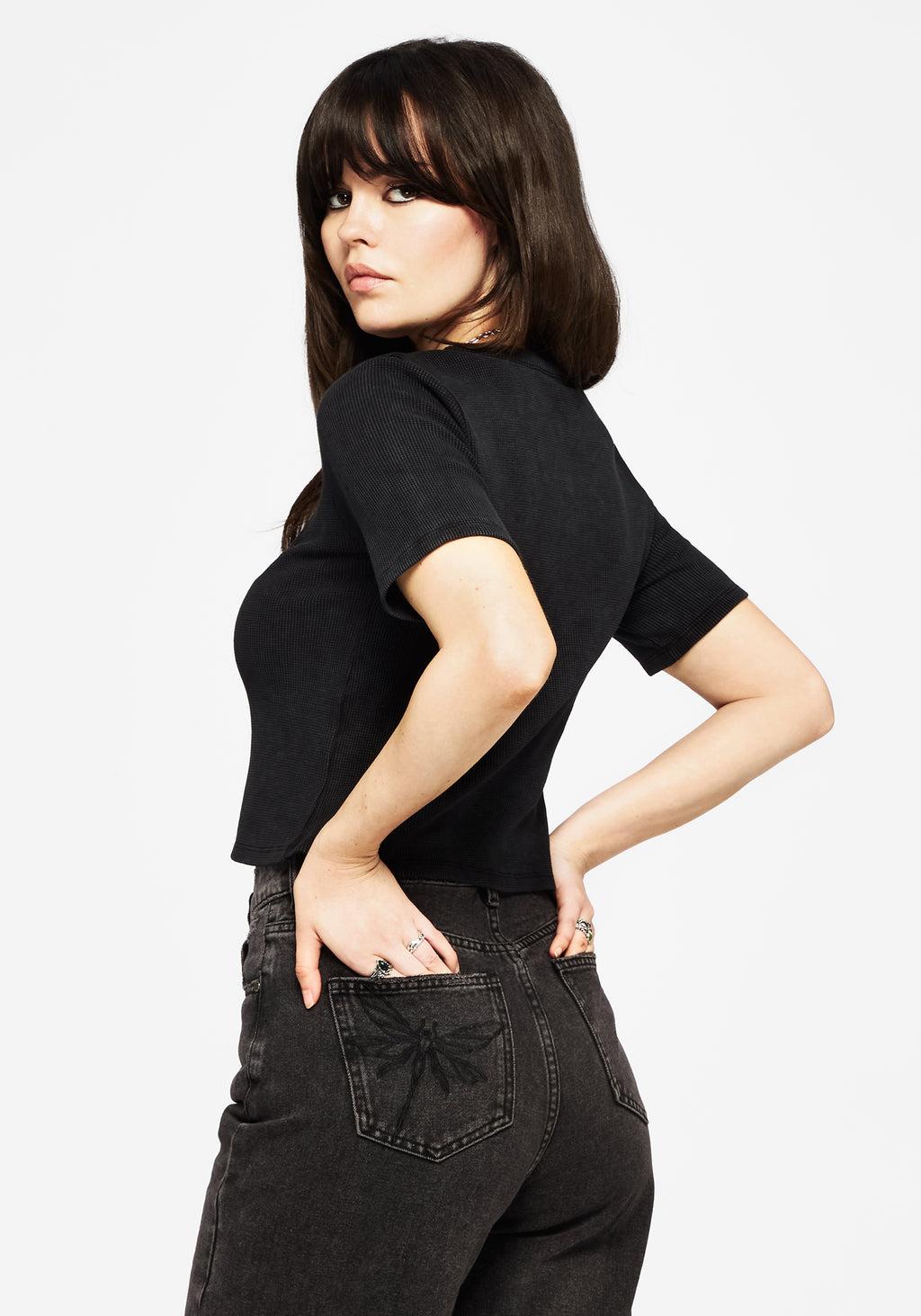 Black Button Up Crop T-Shirt