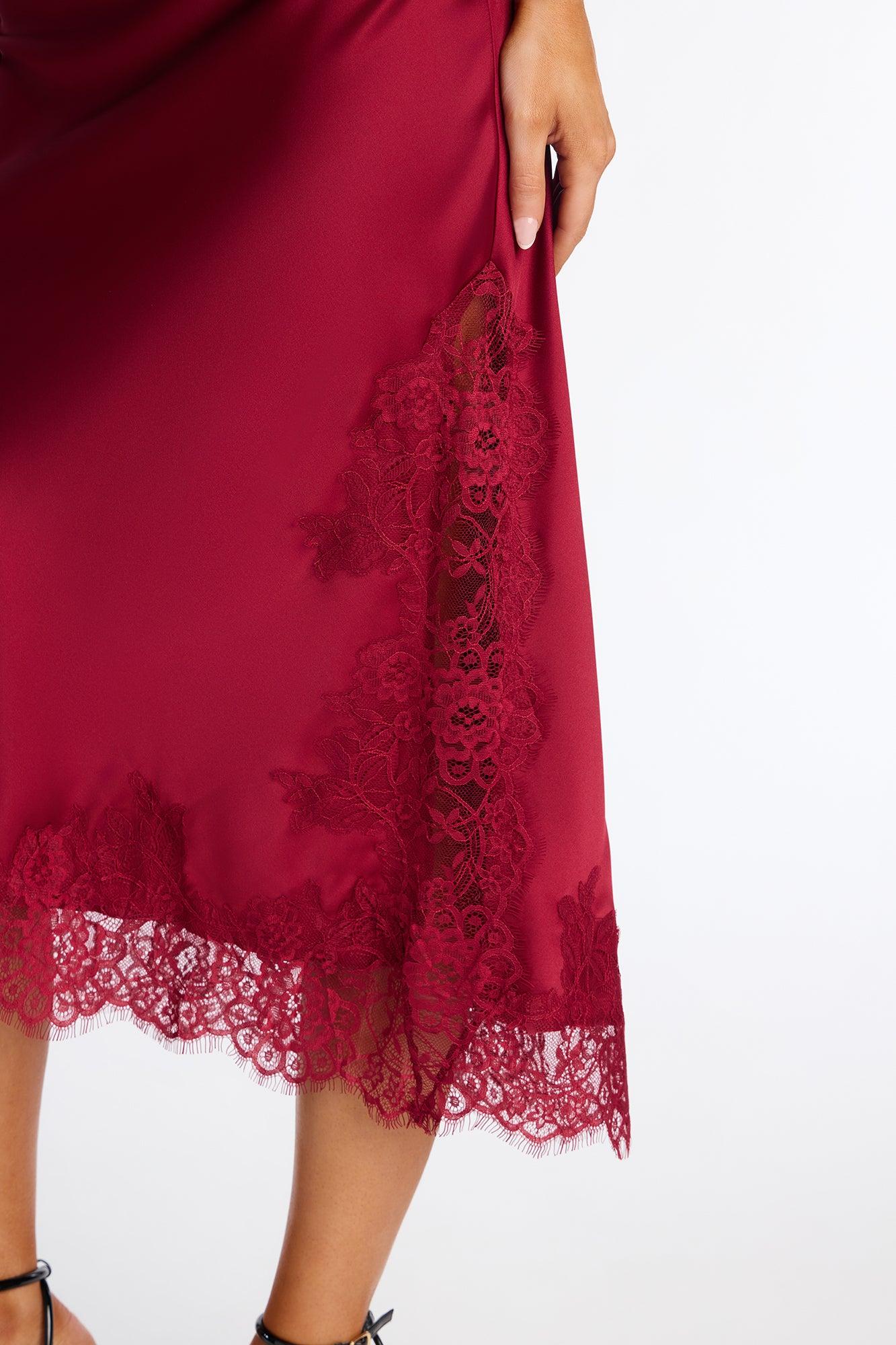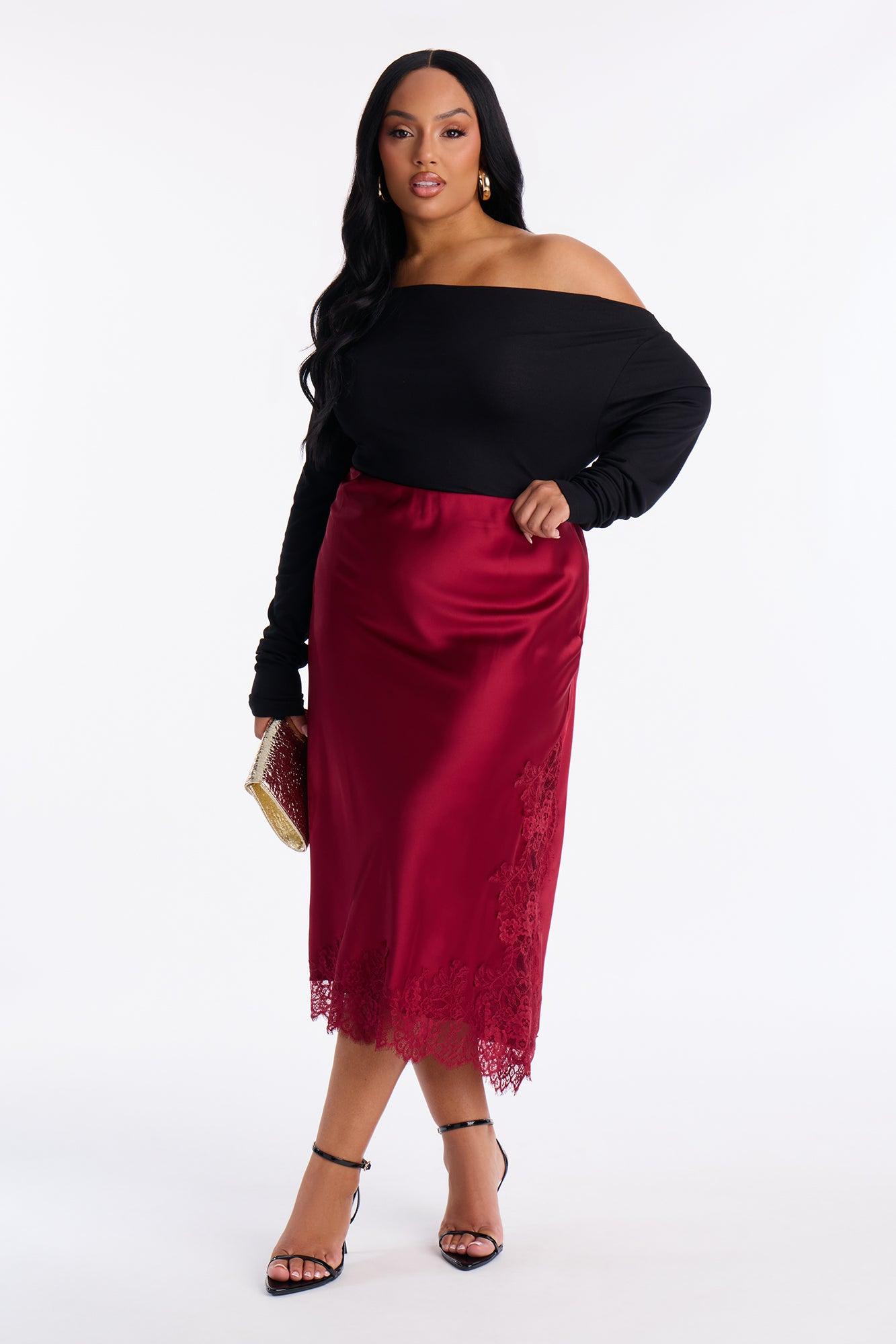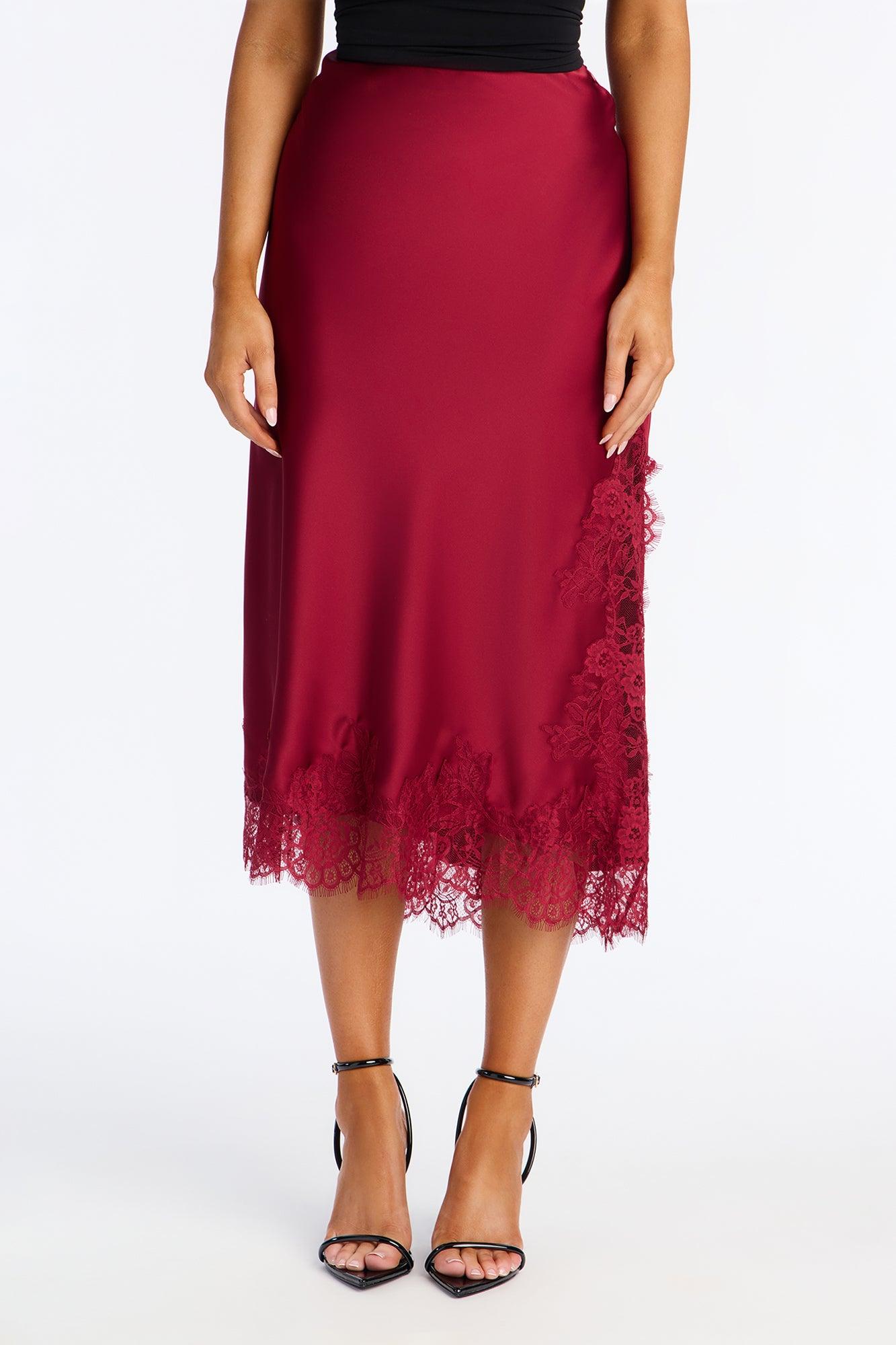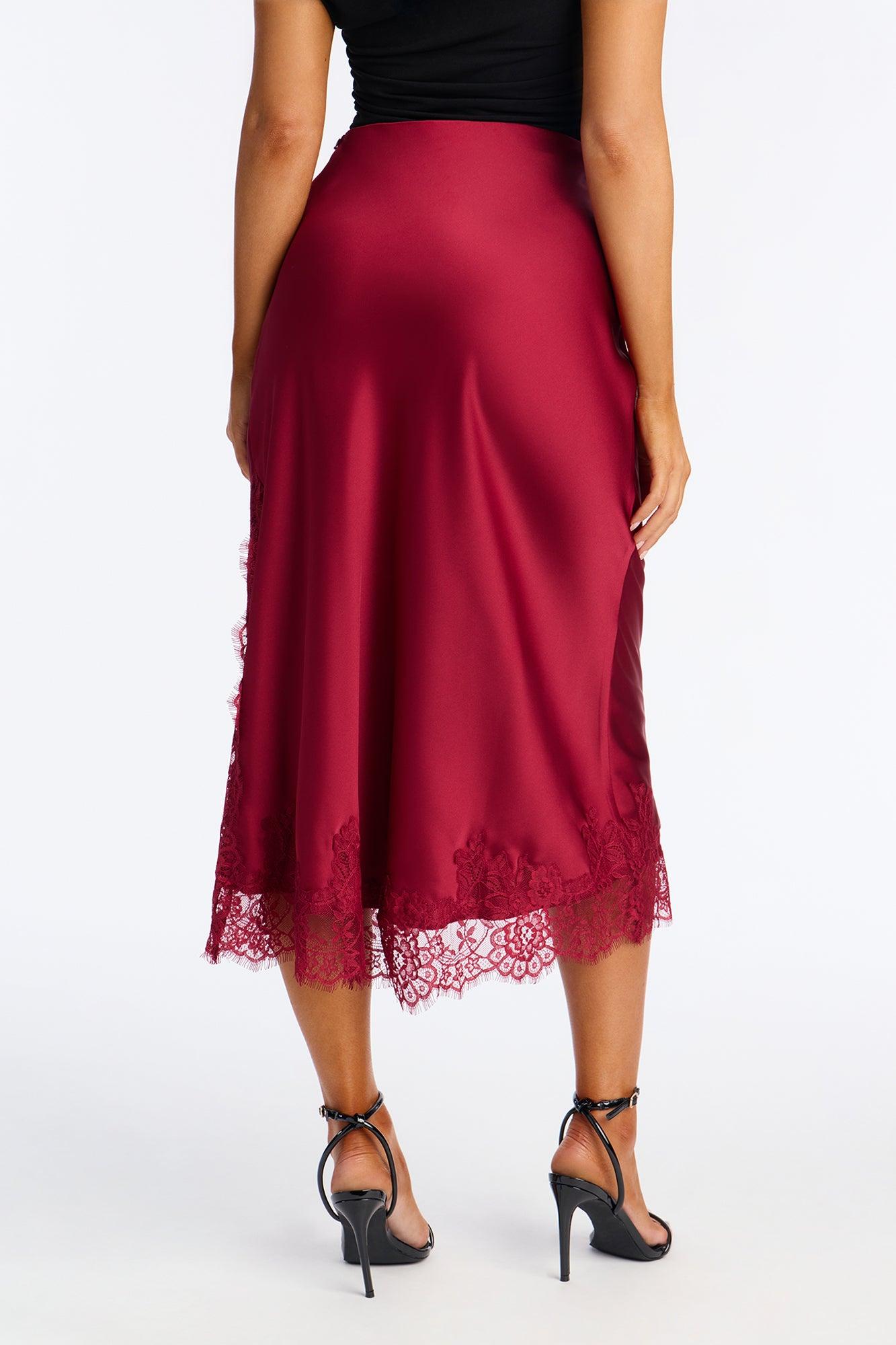 Feel The Love Lace Trim Satin Midi Skirt - Burgundy Female