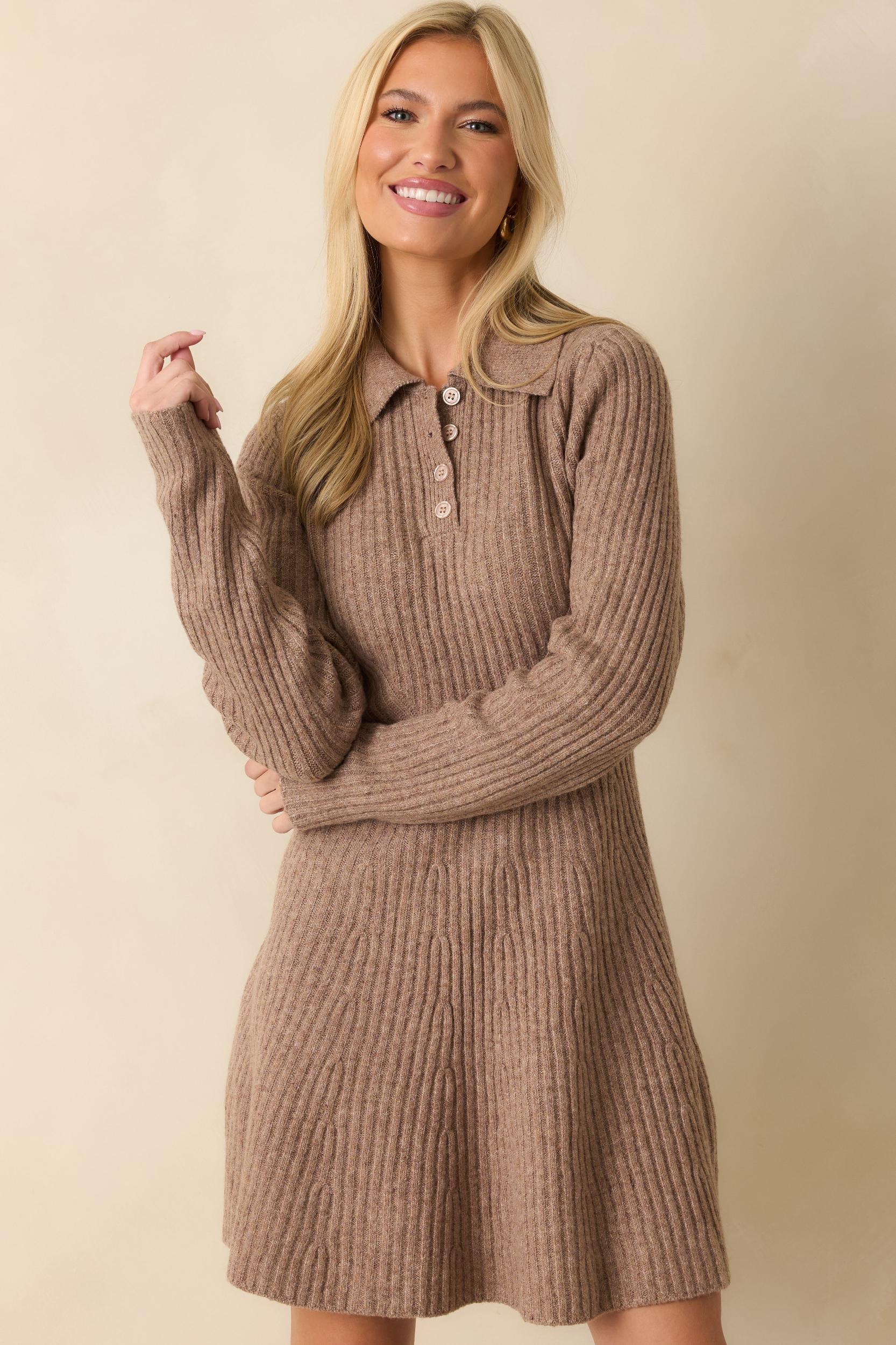 The Feels Like Now Mocha Brown Ribbed Knit Sweater Mini Dress blends cozy texture with timeless charm. Its soft ribbed knit hugs just right through the bodice before gently flaring into a flowy skirt, making it perfect for everything from slow mornings to spontaneous evenings out. This mocha brown sweater dress features long sleeves, a collared neckline with a partial button front, a fitted bodice, and a flared mini-length hem. 65% Polyester, 13% Nylon, 13% Acrylic, 6% Wool, & 3% Spandex Unlined Hand Wash Cold Manufactured in China Designed in the USA Model is 5'8" and wearing size small, clipped, model is a true x-small.