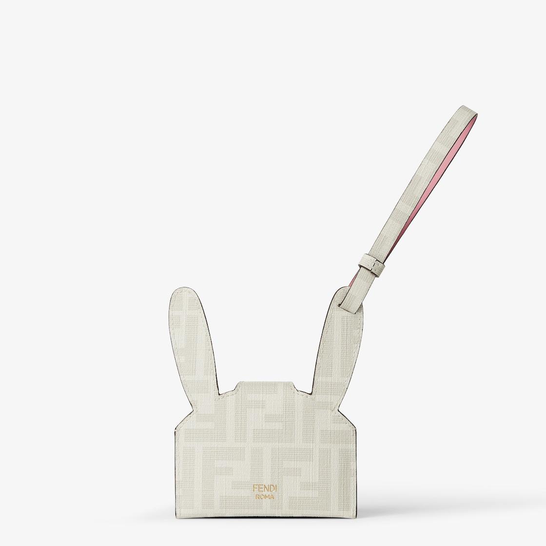 Fendi Best Friends Forever card holder with rabbit-head design. Features an internal compartment and clasp with bridge and hidden snap button. Leather strap to attach it to bags and belts. Made of fabric with the iconic FF motif in white and pink details. Gold-finish metalware. Made in Italy