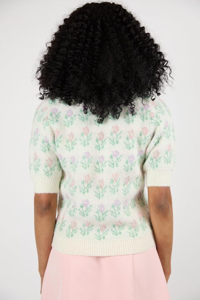 Details Ivory Multi Block Floral Pattern Sweater Fabric has stretch Crew neckline, short sleeves, ribbed hem Unlined Size small from shoulder to hem: 23" Material and Care 6% wool 78% polyester 13% acrylic 3% elastane Hand wash cold, dry flat Patterns may vary Materials may have natural variations Colors may vary from different viewing devices.