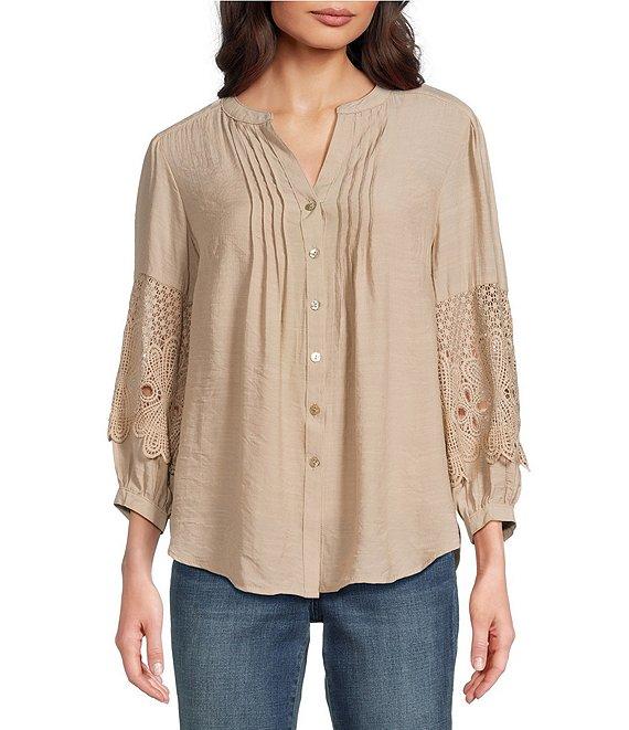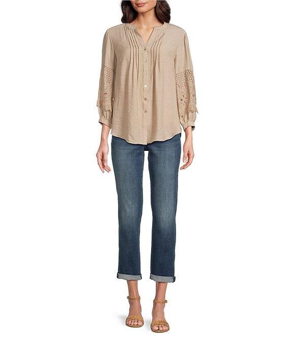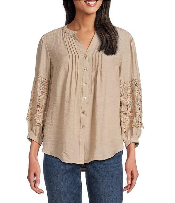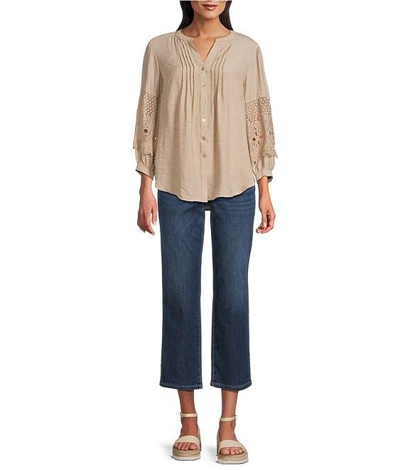 Figueroa & Flower Solid Woven Split V-Neck 3/4 Applique Sleeve Peasant Blouse