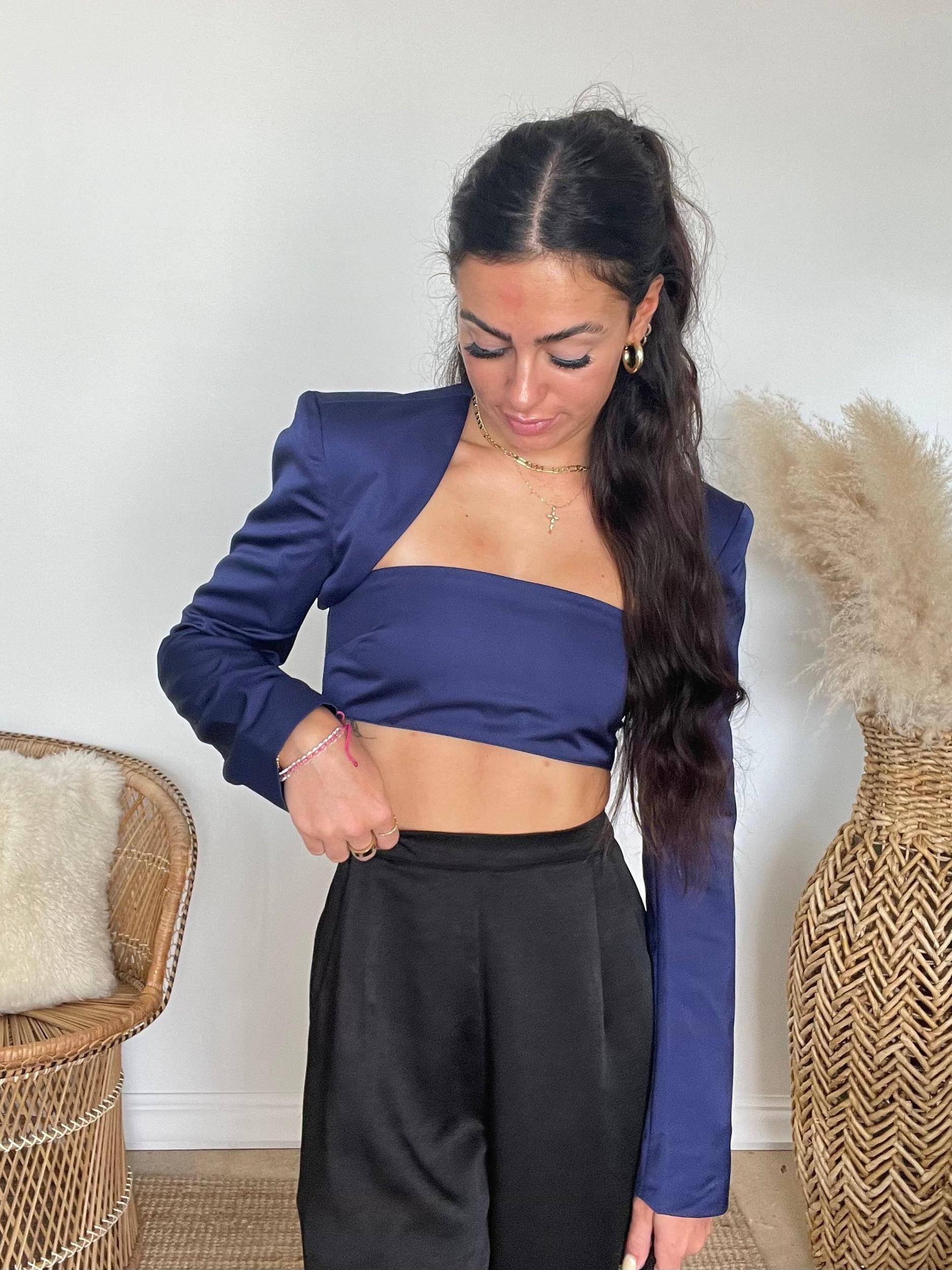 This item is FINAL SALE. No Returns & No Exchanges are permitted on SALE items By WeWoreWhat Strapless Top is Sold Separately Cropped White Shoulder pads Open Front Fully lined Dry clean only