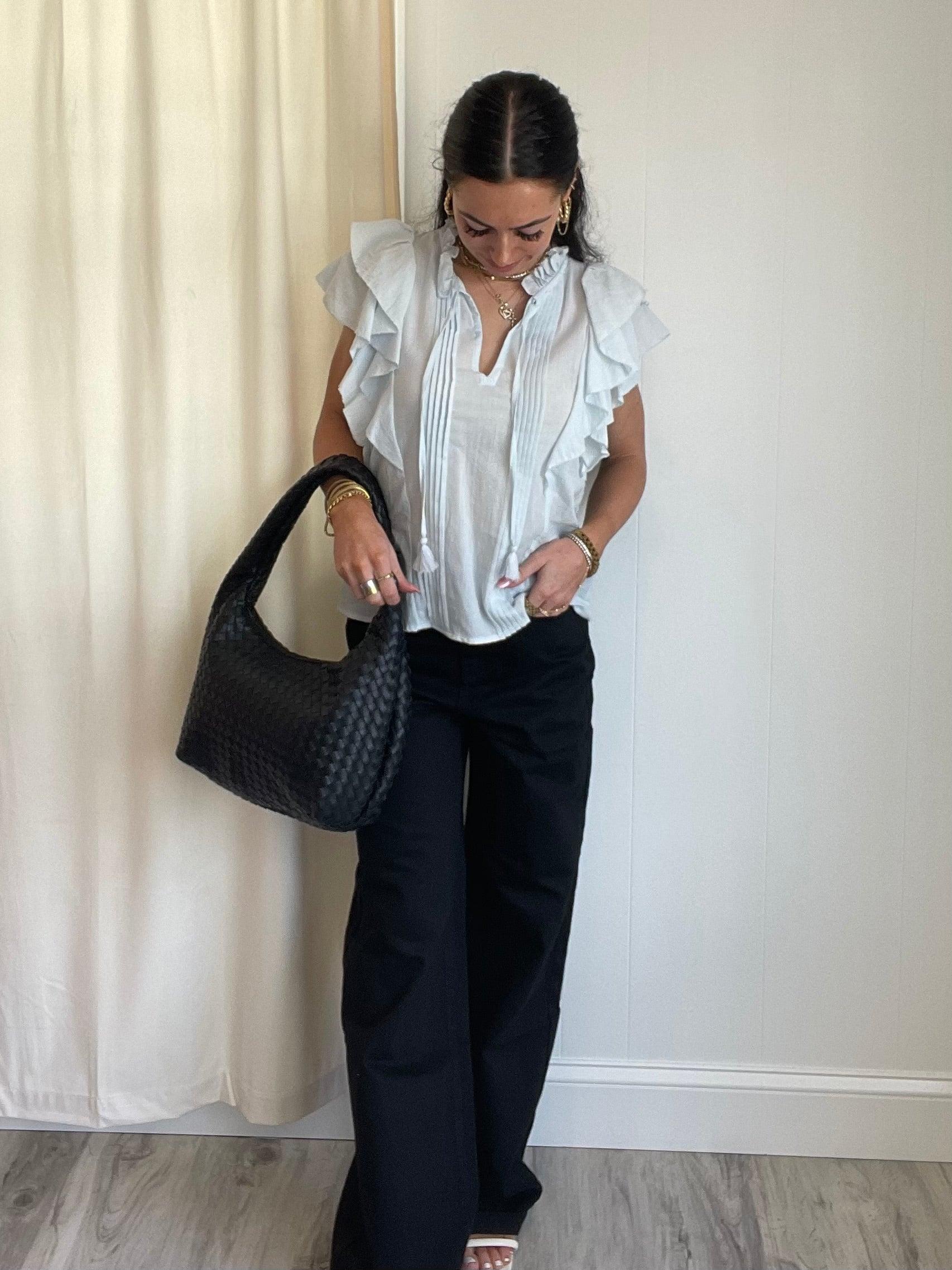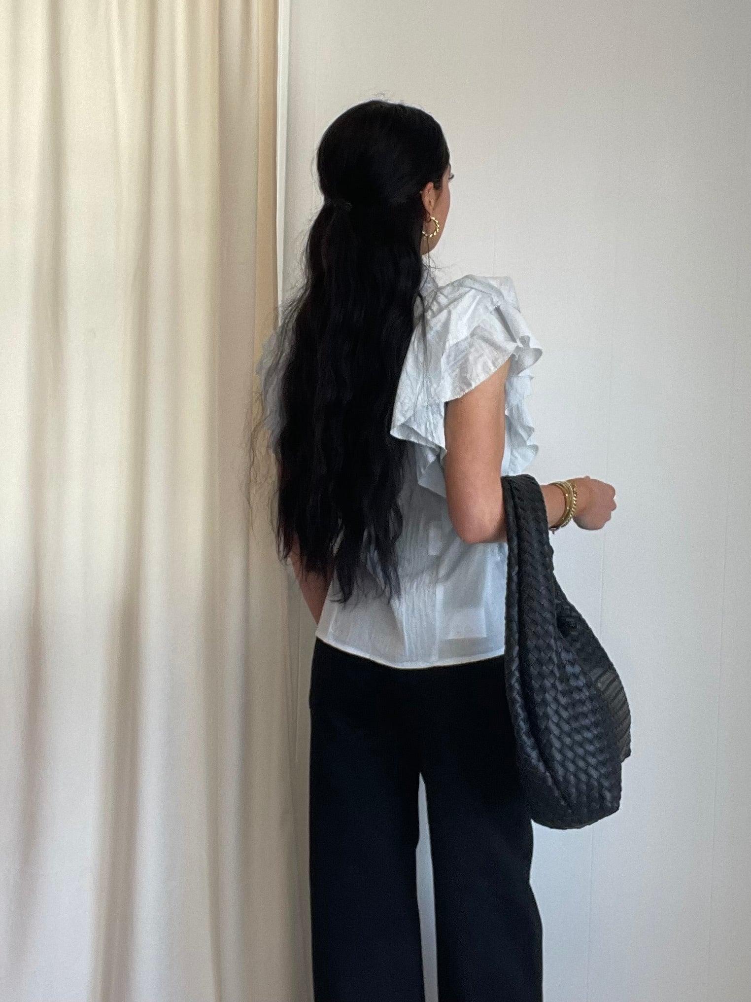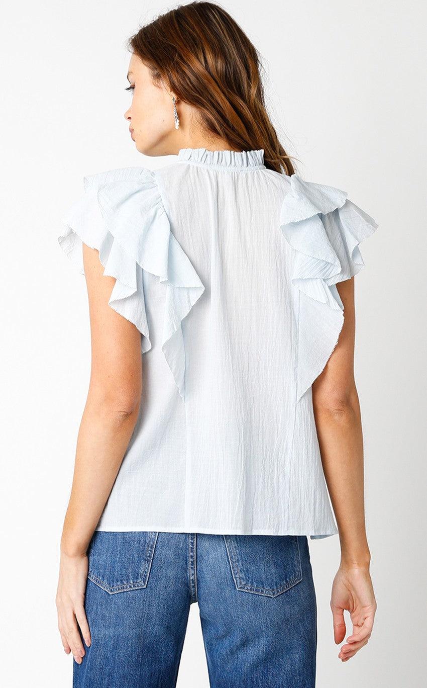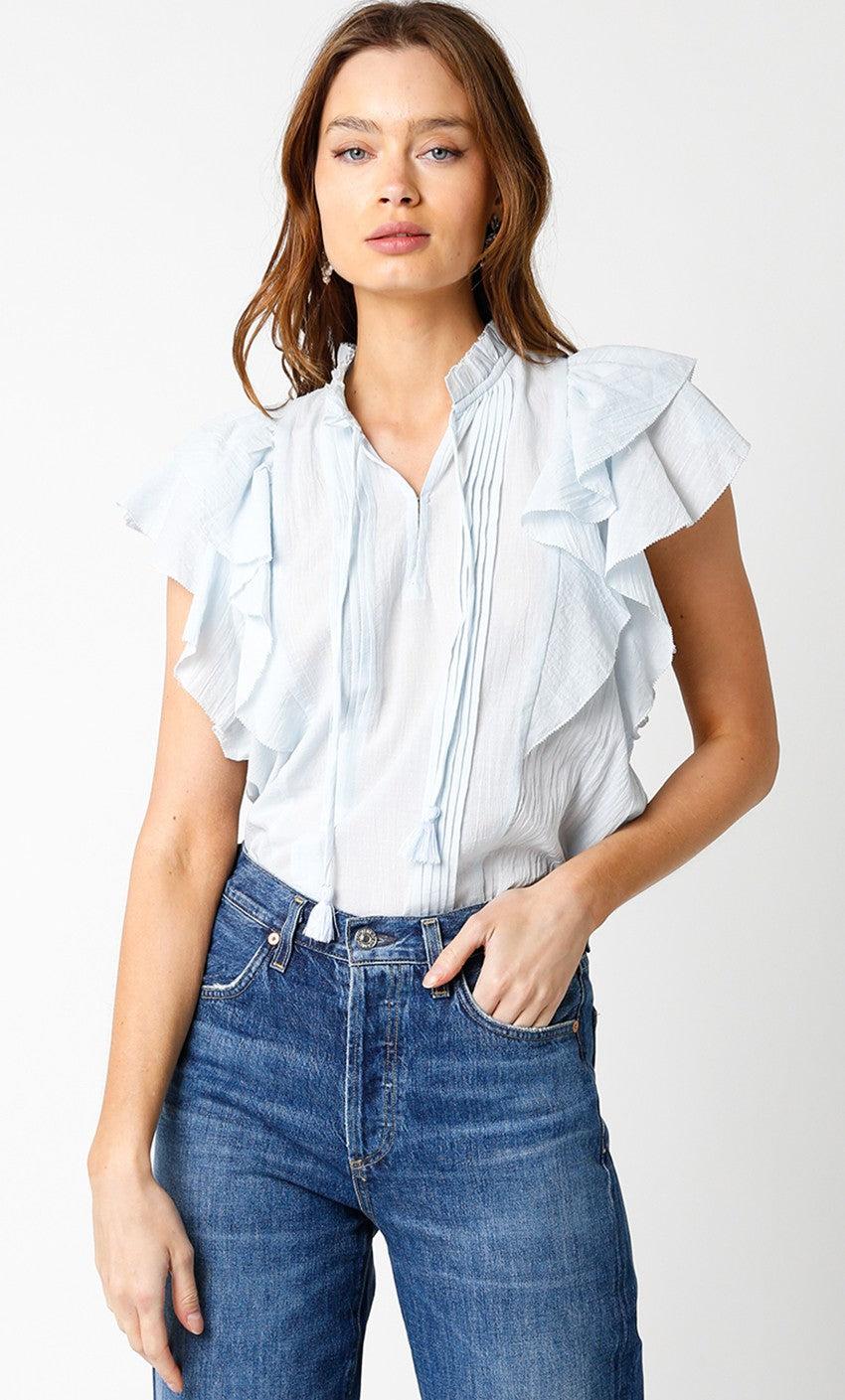 The Zara Top features a relaxed silhouette and V-neckline, with the option of tying it closed. The ruffle sleeves add a touch of charm and versatility to this piece.