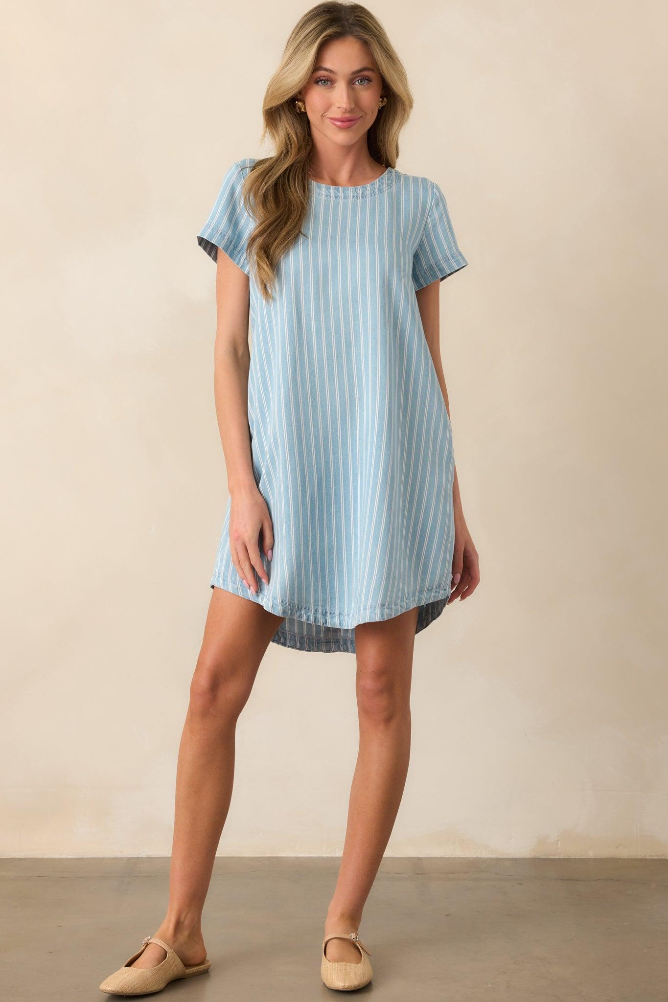 The Finding The Courage Light Wash Stripe Chambray Mini Dress is all about quiet confidence and fresh starts. Easygoing yet meaningful, it’s perfect for those moments when you’re ready to step into something new. This mini dress features a round neckline, cuffed short sleeves, a faux button back with two functional top buttons, a scoop hemline, and functional pockets. 100% Lyocell Unlined Hand Wash Cold Manufactured in Vietnam Designed in The USA Model is 5'8" and Wearing a Size Small