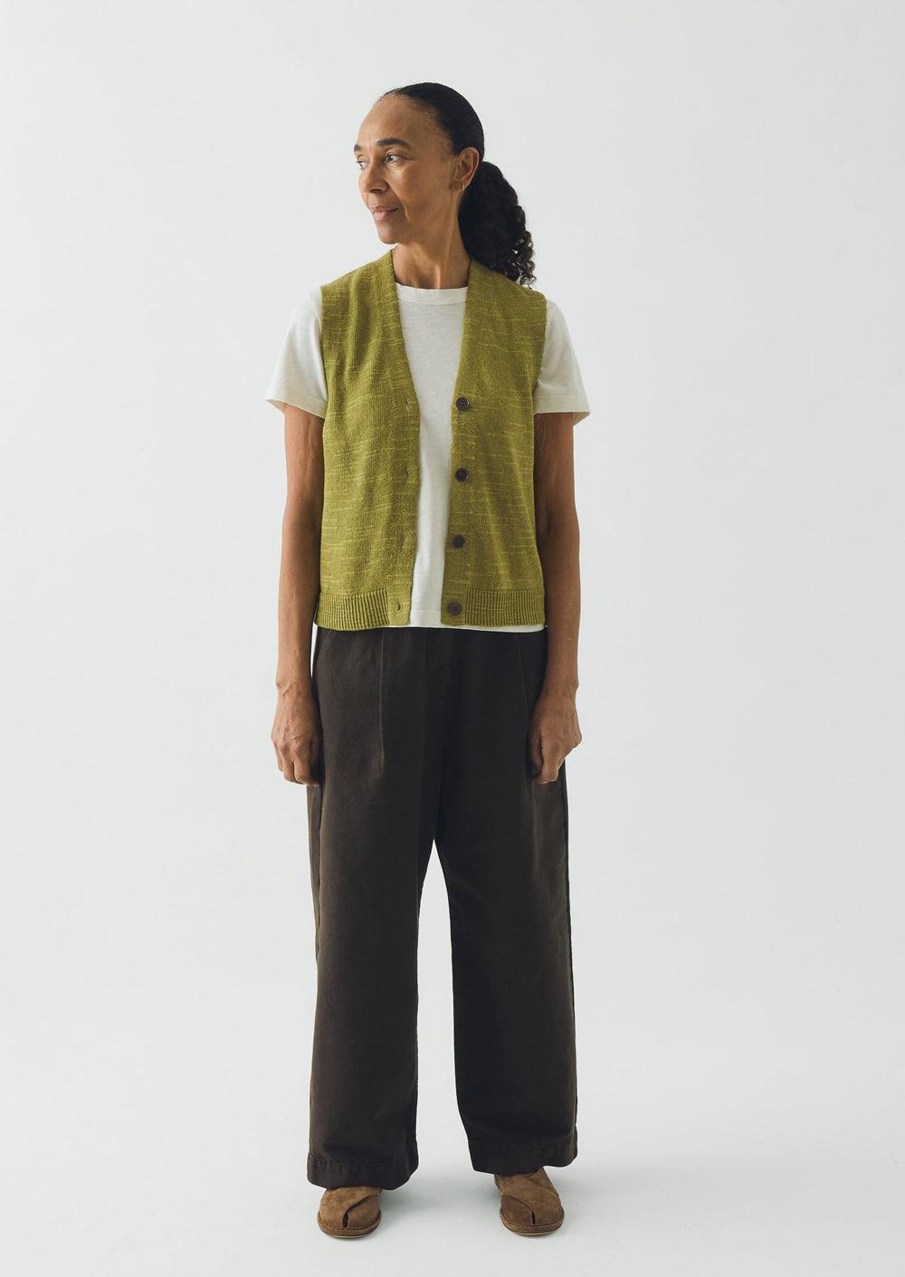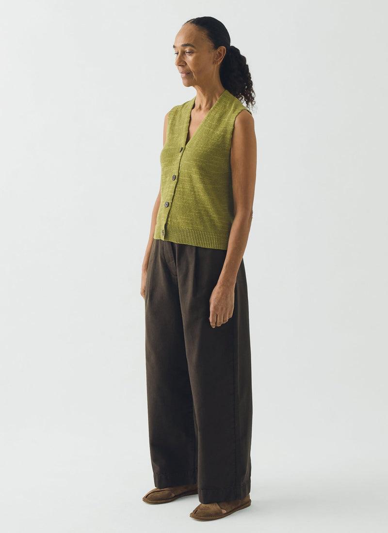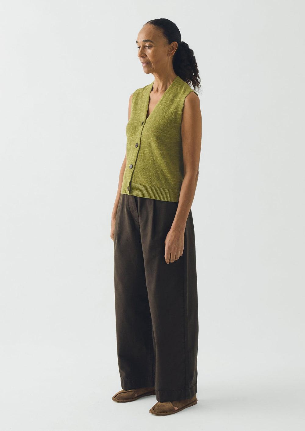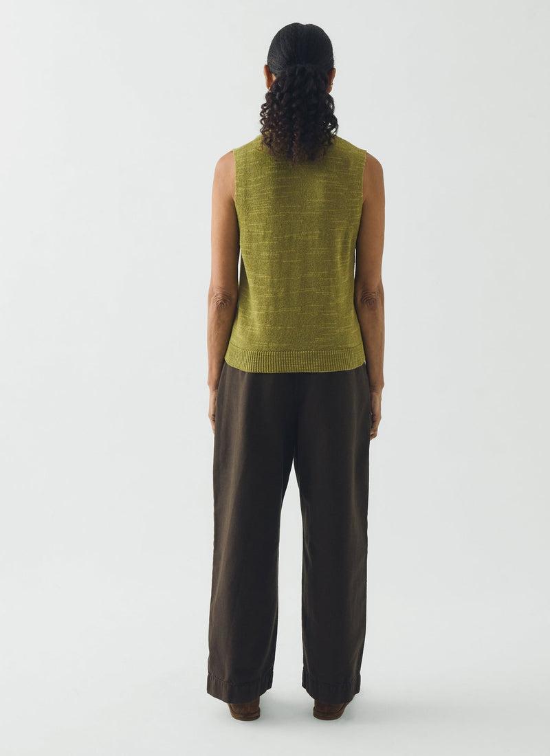 Corozo buttons punctuate the front of our knitted tank. Made from lightweight, slubbed cotton and linen-blend yarn to a V-neck shape, falling to a ribbed hem at the mid hip.