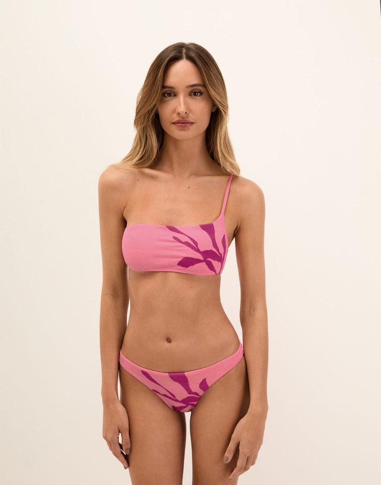 The ViX Firenze Molly Ana Top is a one shoulder bandeau style bikini top with a scooped neckline and adorned with a laser-cut floral pattern in a contrasting color with our exclusive textured lycra. Style the Molly Ana Top with a matching bikini bottom and cover up for a vacation-ready look. Features: One shoulder bik