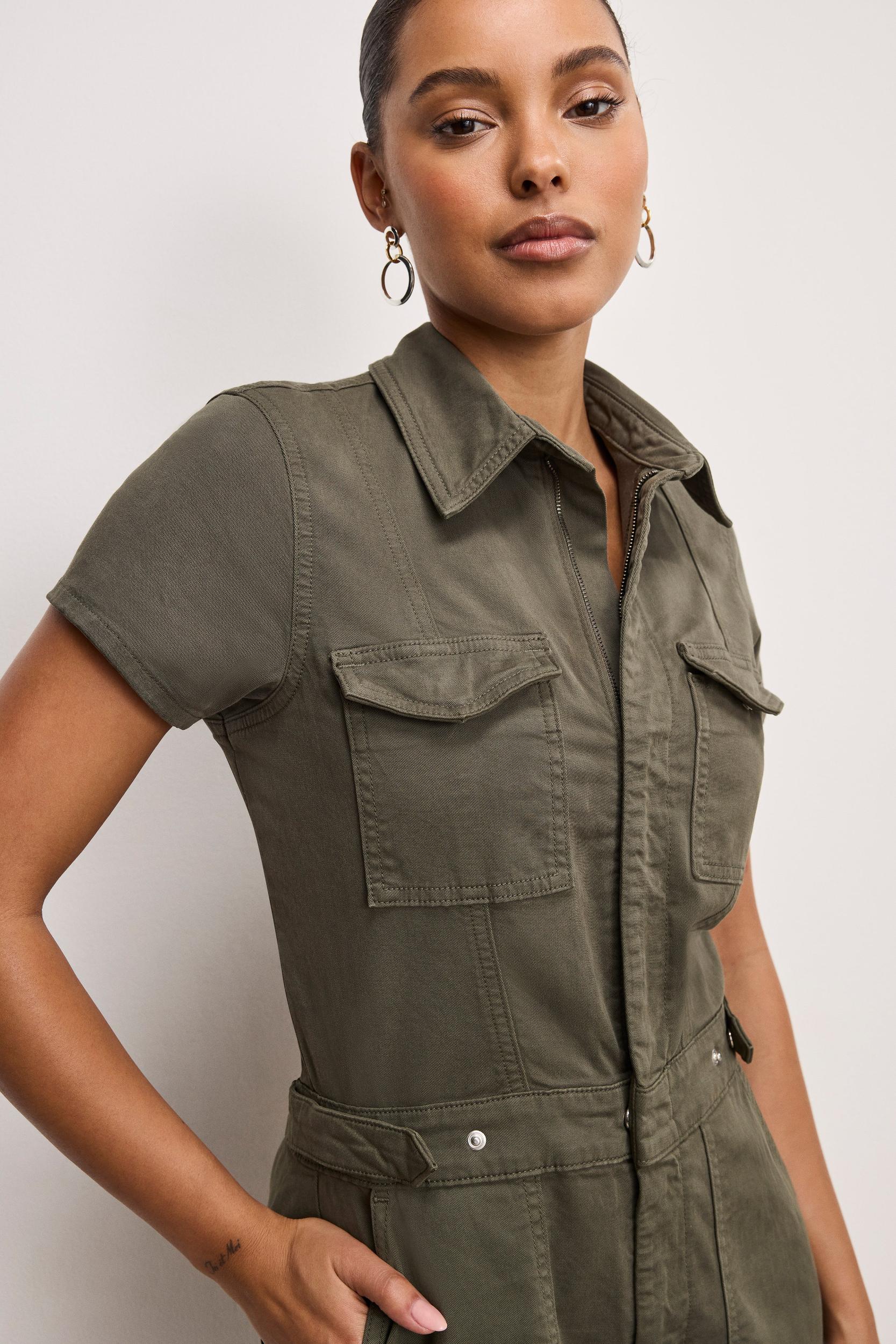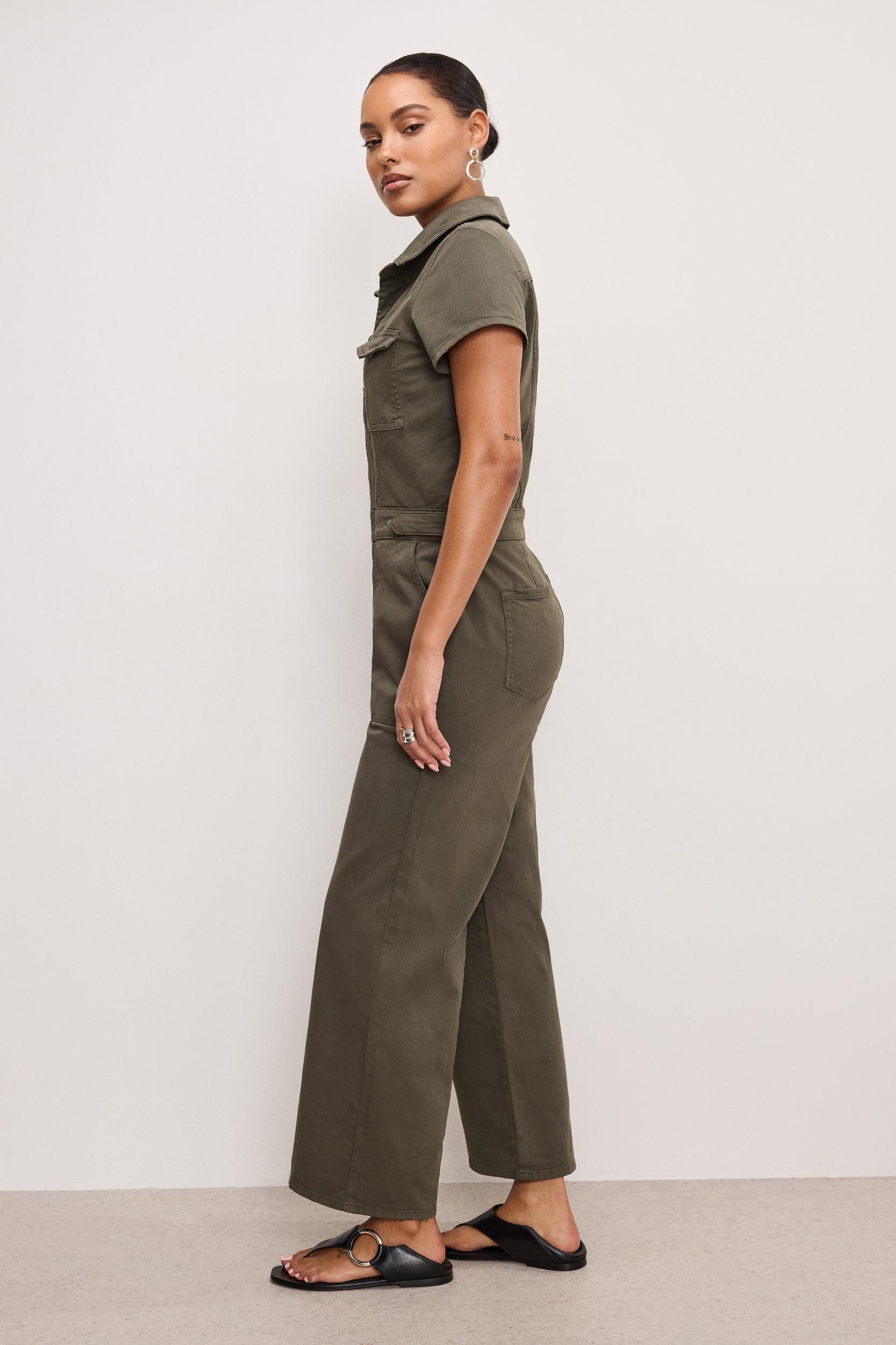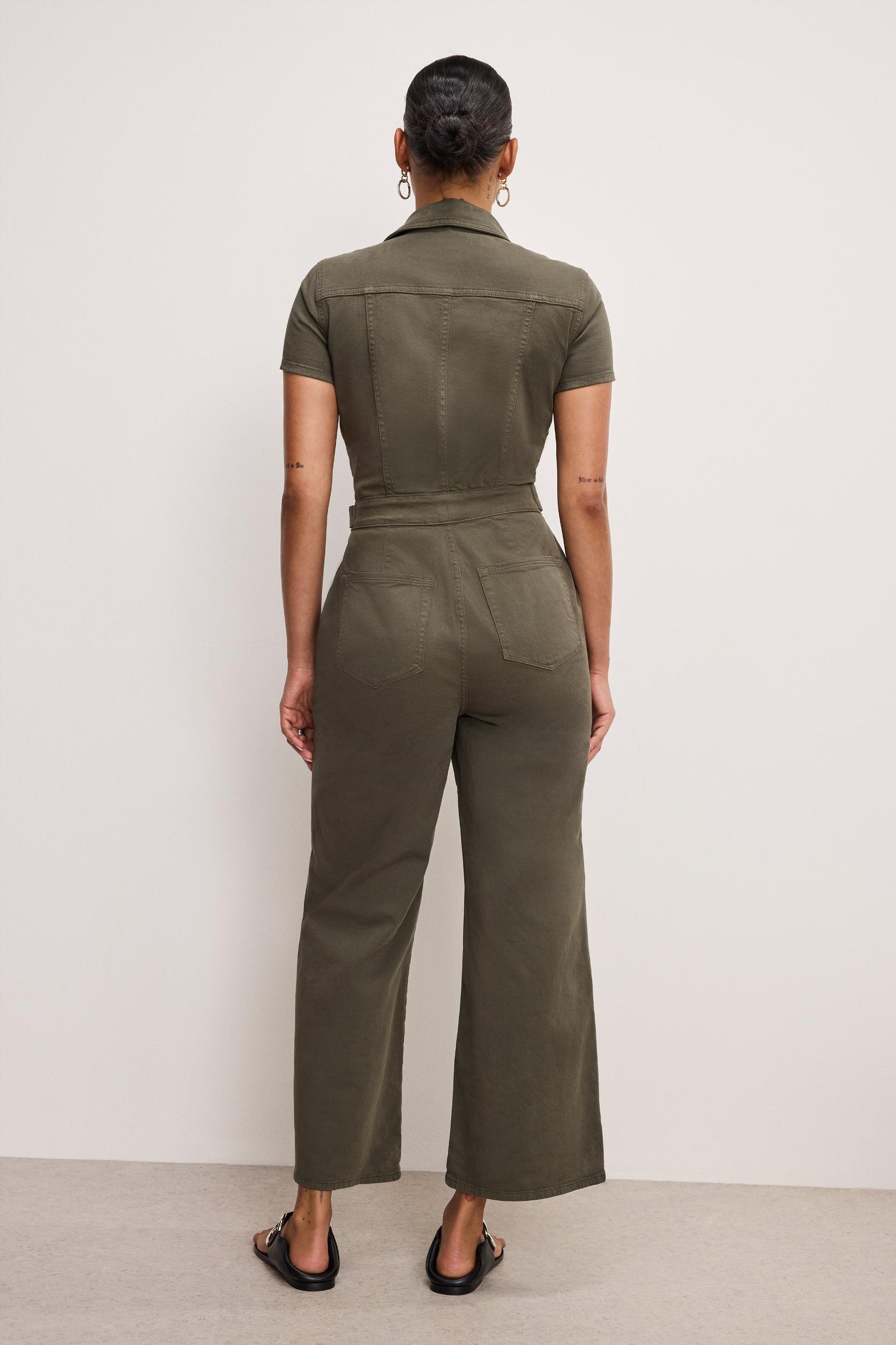 Our Fit For Success Twill Palazzo Cropped Jumpsuit brings an unmatched ease. With a relaxed silhouette, tailored details and cropped legs, it's a laid-back take on looking sharp. Collar neckline Short sleeves Twill fabric Wide palazzo legs Hidden front zipper closure Chest, side and back pockets Snap button closures at the waistline Adjustable snap buttons at the waist that let you decide how snatched you want to go