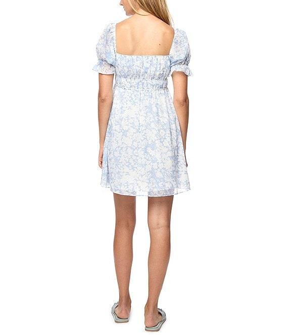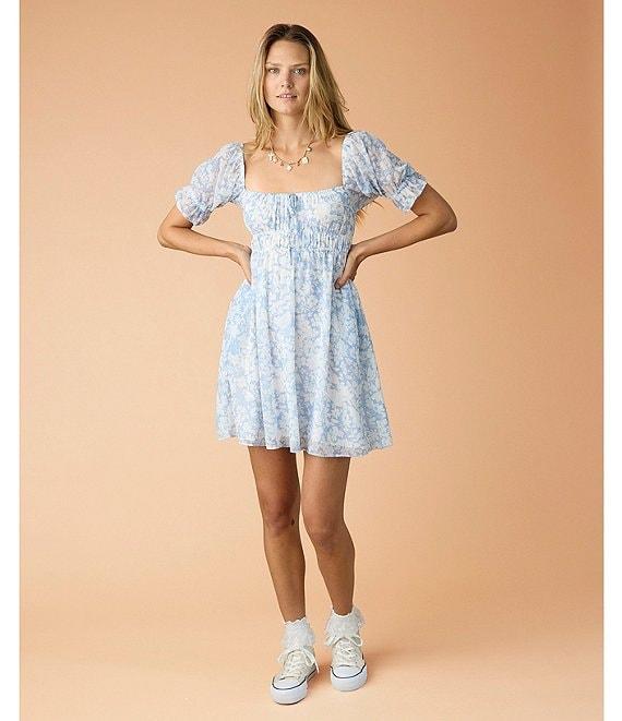 From Flag and Anthem, this dress features: Allover floral print Ruffle-trimmed, elasticized square neckline Elasticized puffed sleeves Fitted bodice with a seamed bust and decorative tying detail at the center High waist A-line skirt with a flirty hem 34” front-body length from highest point shoulder Lightweight woven crinkle polyester chiffon fabric Machine wash/line dry Imported.