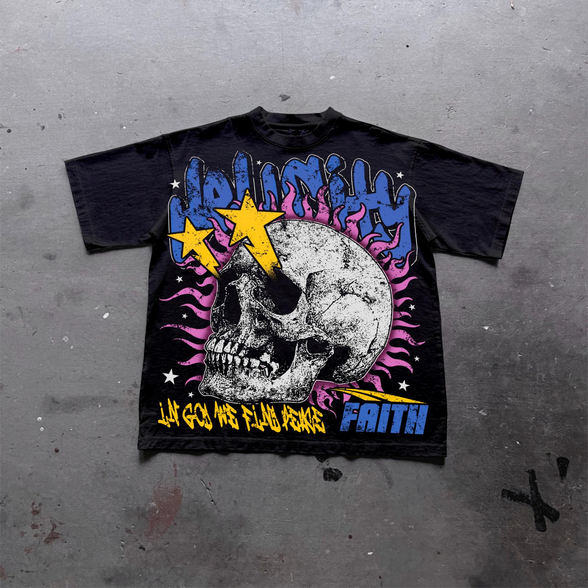 Flame Skull & Hell City Faith Vintage Old Graphic Cotton T-Shirt