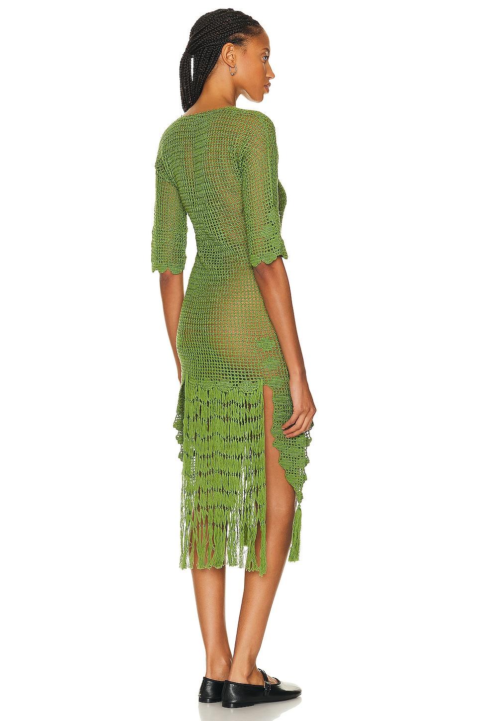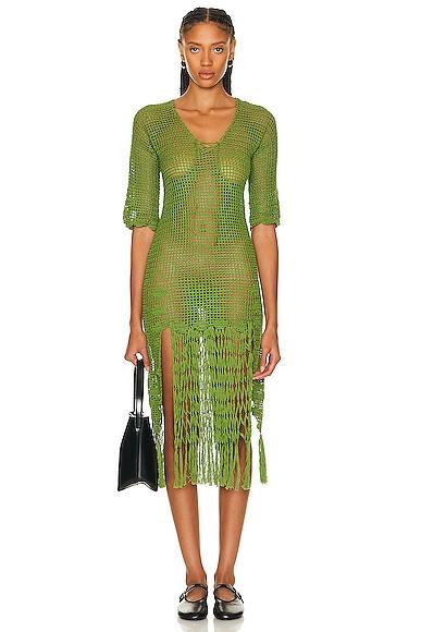 BODE Flint Dress in Green 100% cotton. Made in Peru. Dry clean only. Unlined. Pull-on styling. Crochet knit fabric with fringe hem. Garment is intentionally sheer, undergarments will show through.. Please note undergarment not included. BOFE-WD4. WRF23KT006. About the designer: