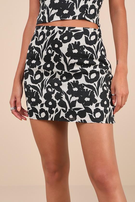Step out feeling confident in your look when you're wearing the Lulus Flirty Direction Black and Ivory Floral Linen Mini Skirt! Lightweight, linen-blend woven fabric (with an abstract floral print throughout) shapes this cute skirt that has a high waist and flattering silhouette, ending at a mini hem. Hidden zipper/clasp at side. Pair with the matching top for a complete look!