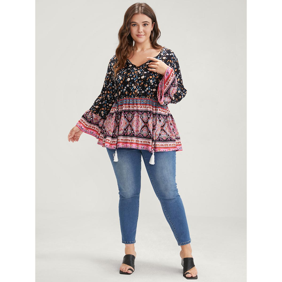 Floral Print Bohemian Plus Size Women Vocation Sundress Tribal Ties Bell Sleeve V Neck Casual Blouses BloomChic Product Image