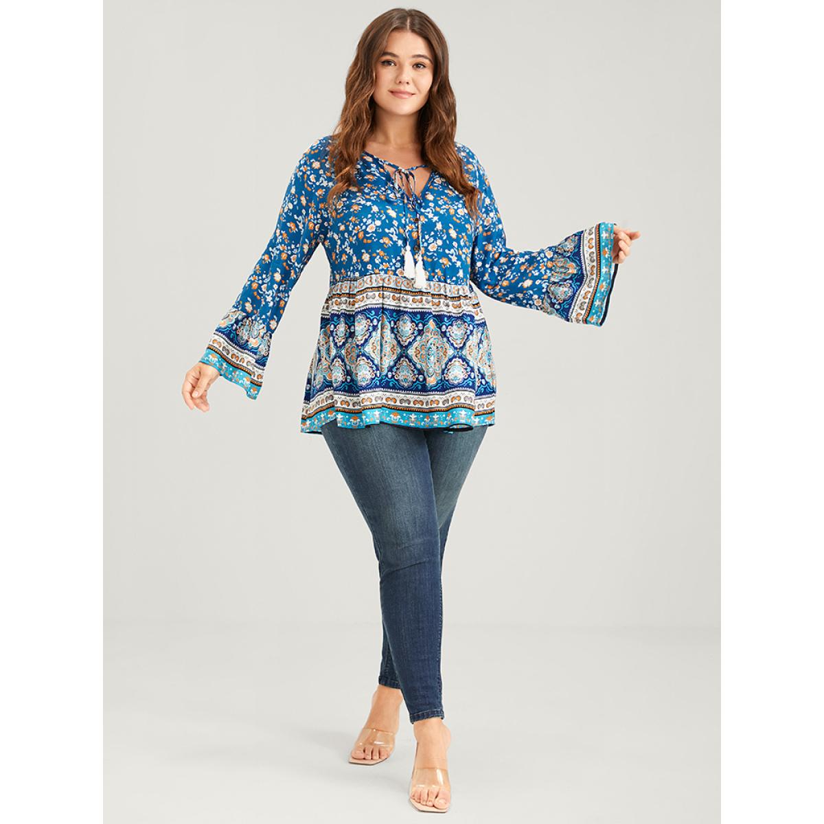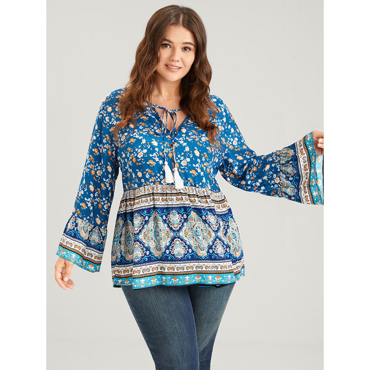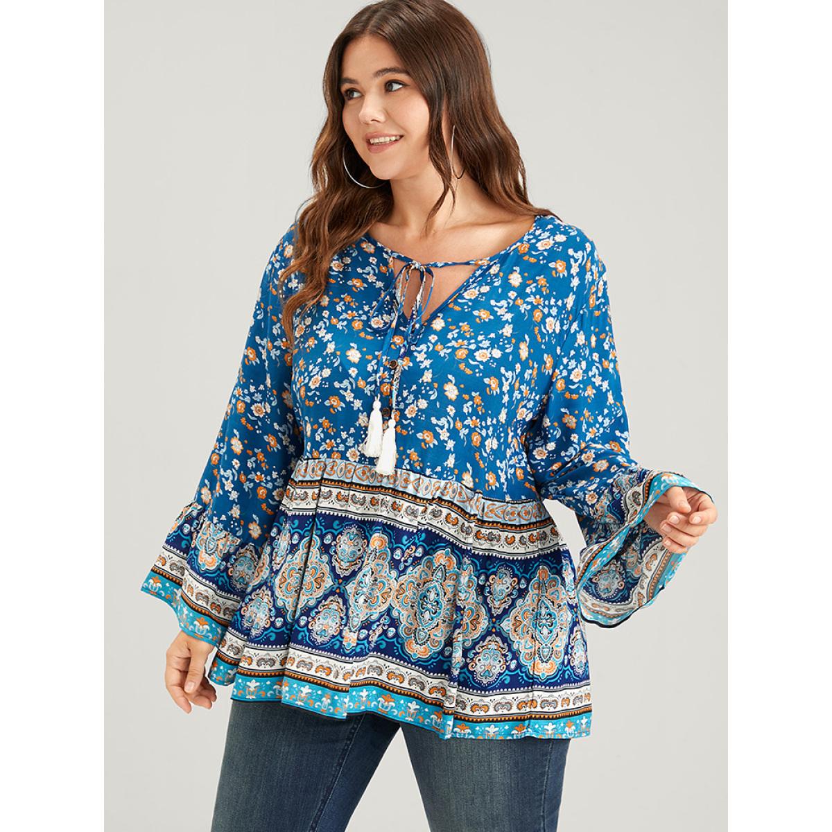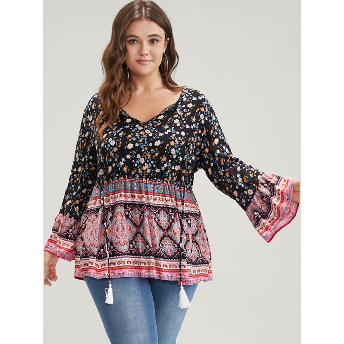 Floral Print Bohemian Plus Size Women Vocation Sundress Tribal Ties Bell Sleeve V Neck Casual Blouses BloomChic