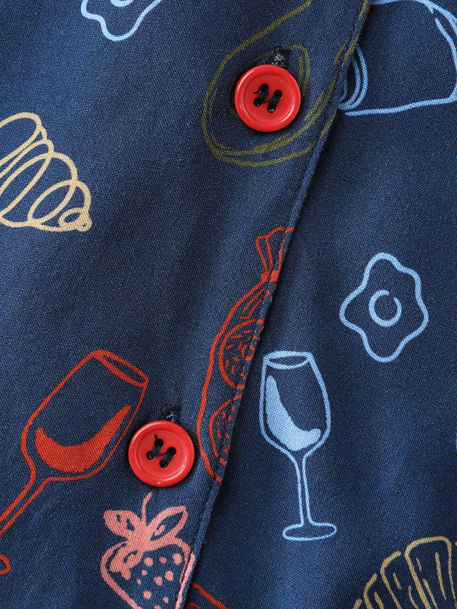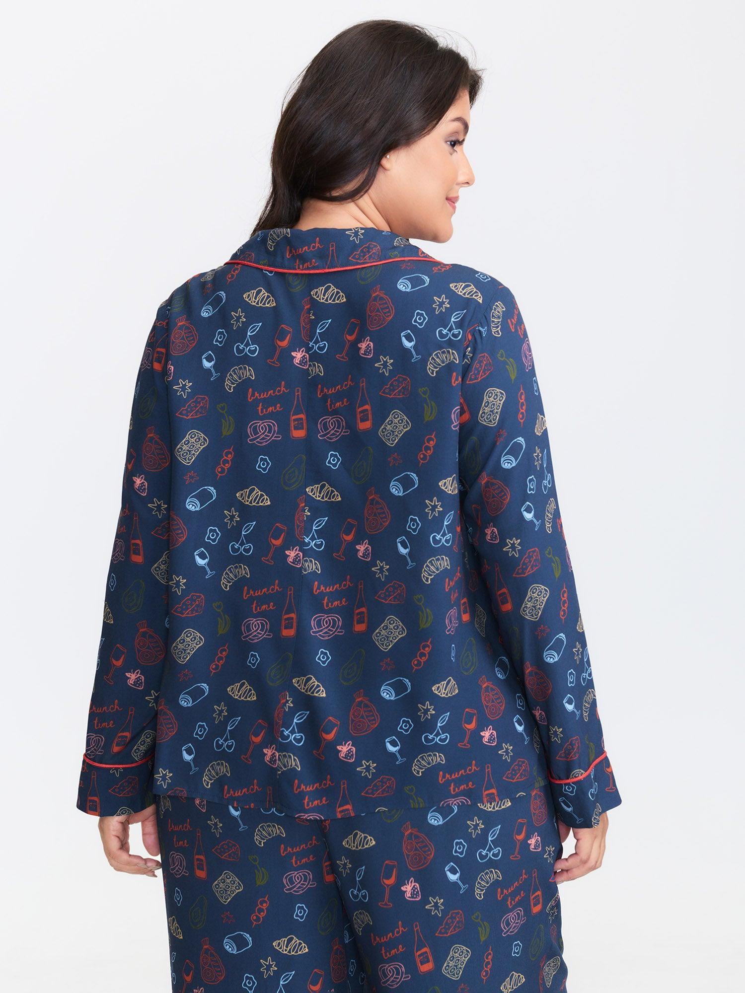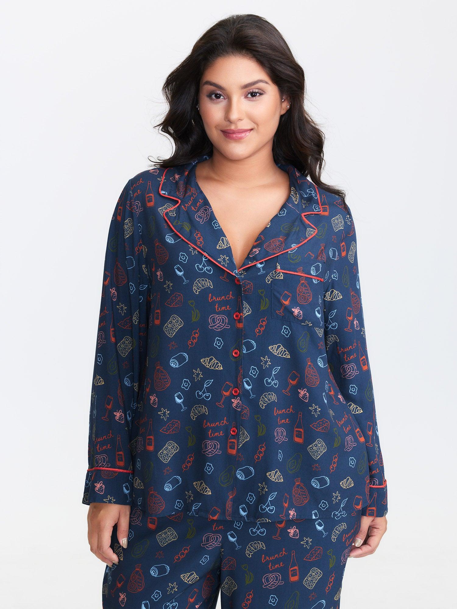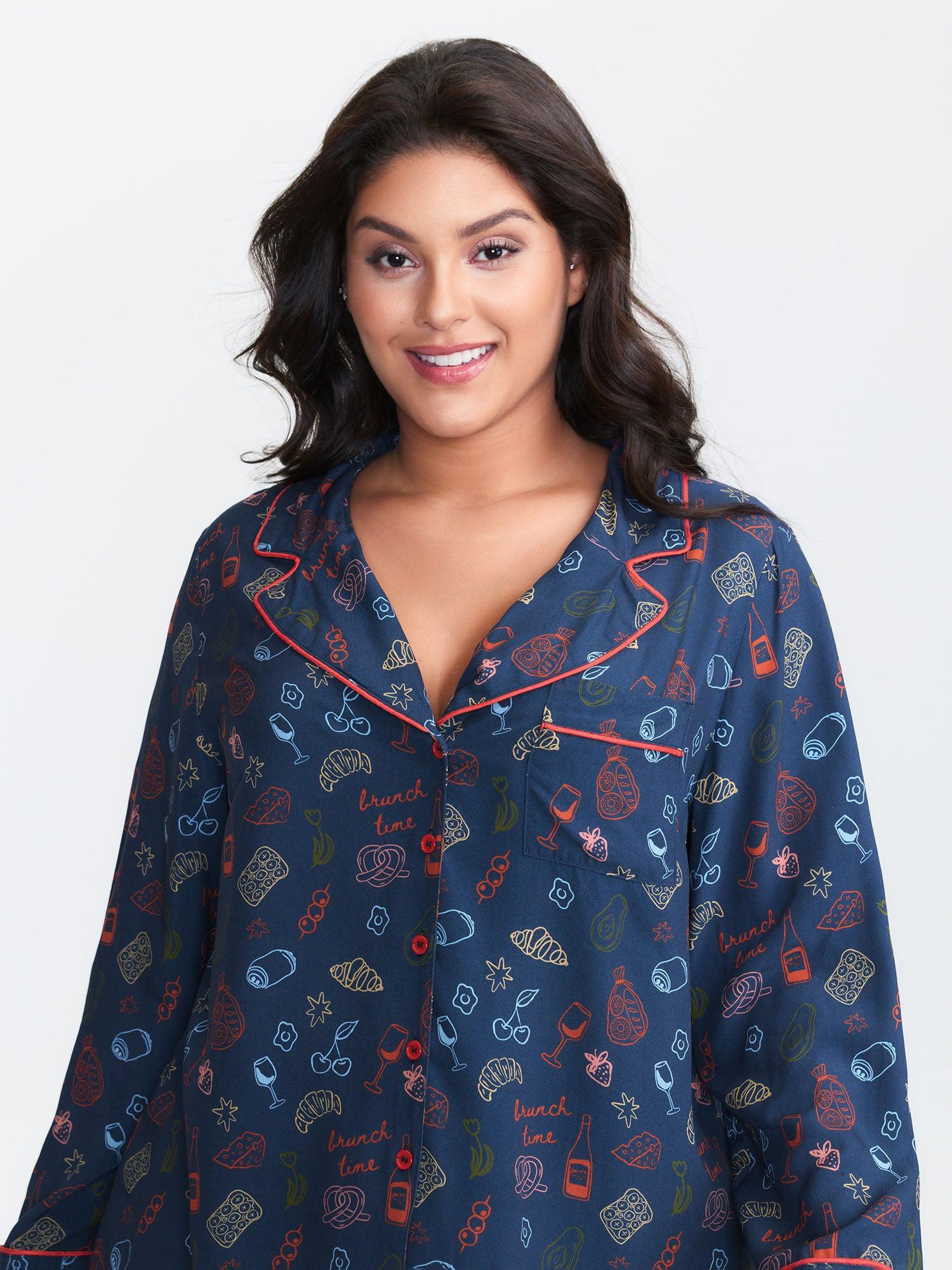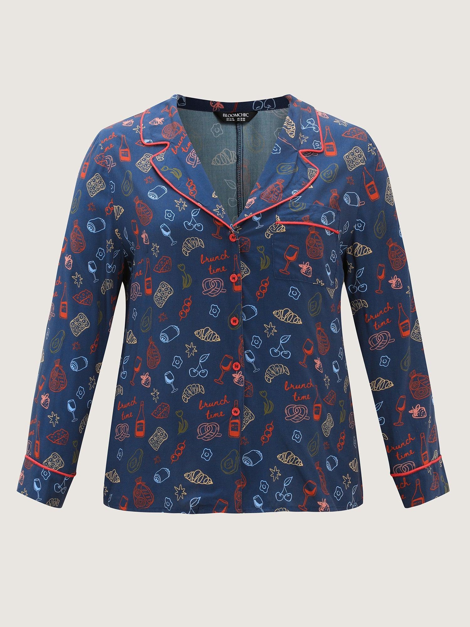 Shop Floral Print Color Contrast Sleep Top now and redefine your style with confidence at BloomChic. Tailored for mid and plus-size women. This trendy Loungewear Women, sizes 10-30. Color:Indigo;Style:Playful;Neckline:Shirt collar;Sleeve Type:Regular Sleeve;Prints:Fruit and vegetable print;Details:Woven ribbon&lace trim, Button, Contrast;Pocket:Patch pocket;Belt:No-belt;Closure Type:Open front with closure