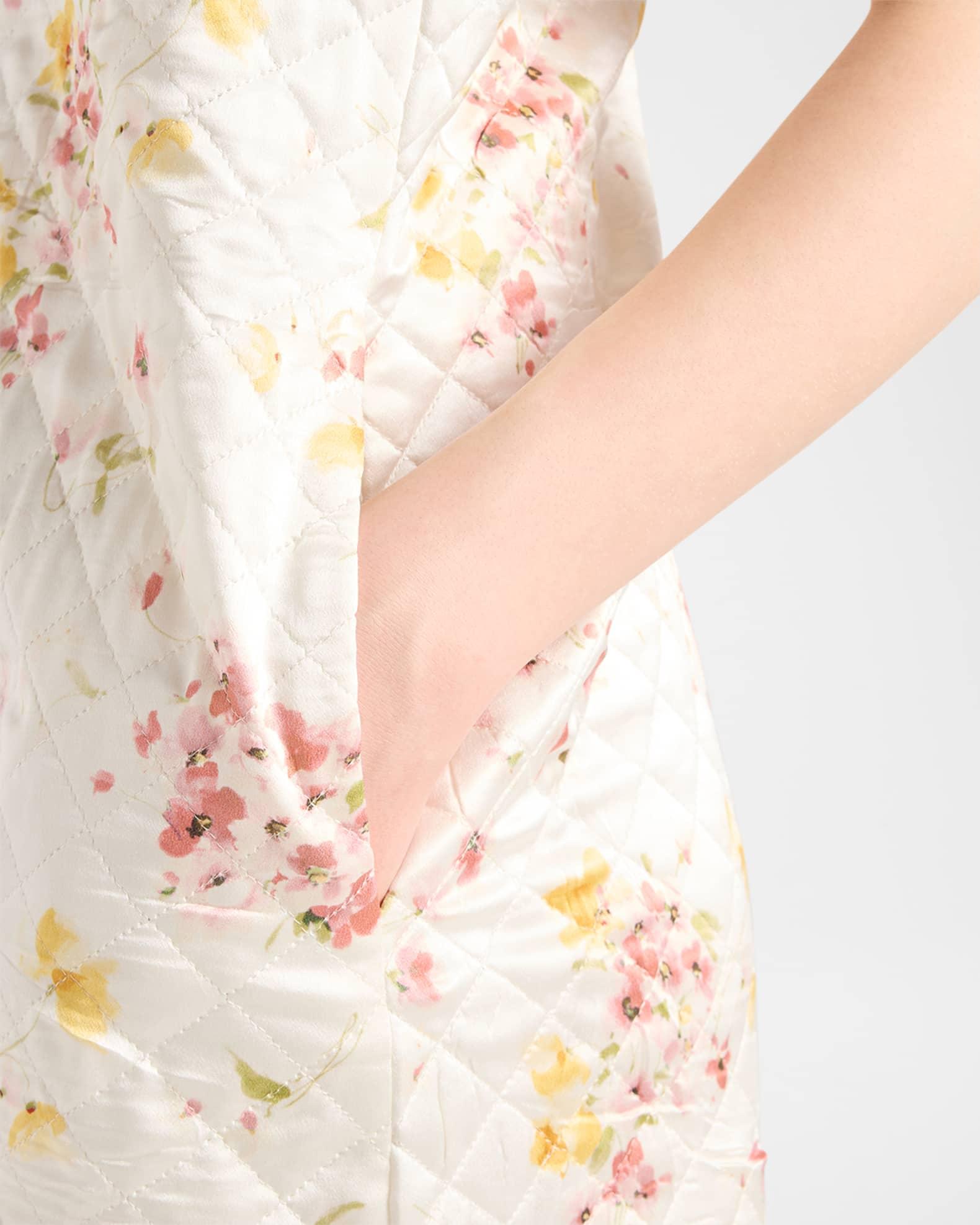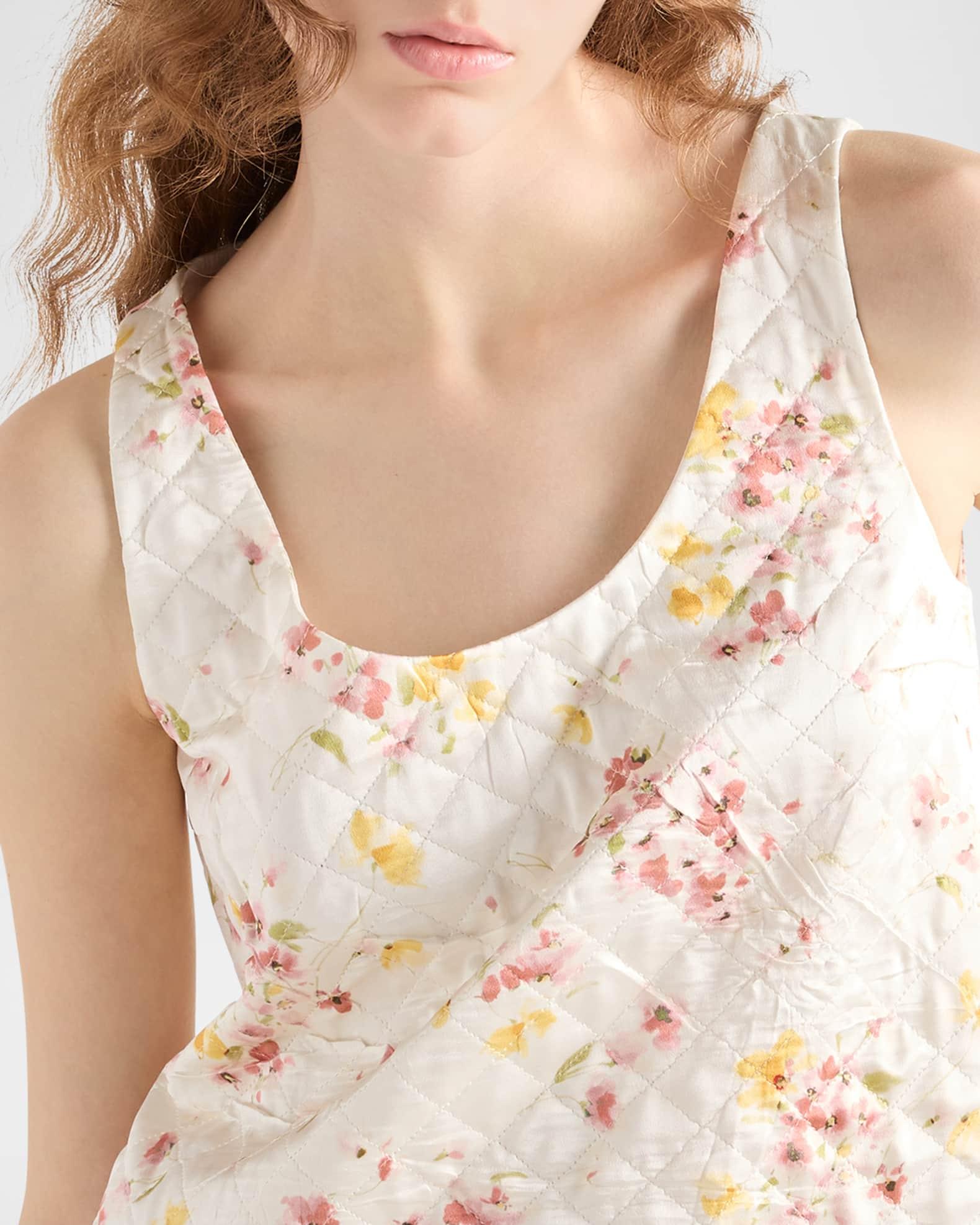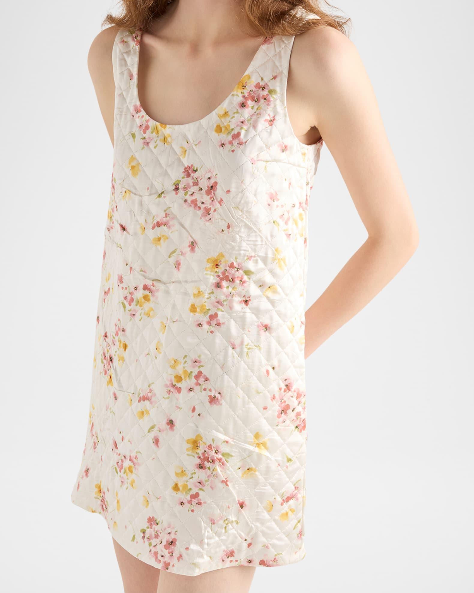 Romantic and nostalgic, this Prada mini dress is designed in quilted silk satin and finished with soft wrinkling and vintage-effect Bouquet floral print Approx. 31.5"L from shoulders to hem Scoop neckline Sleeveless On-seam pockets Hem falls above the knee Shift silhouette Silk Made in Italy