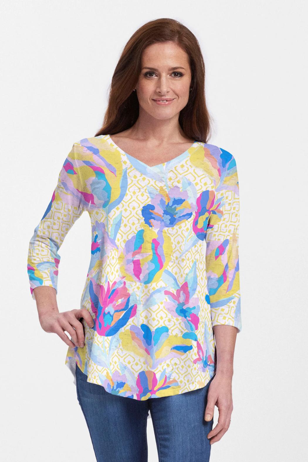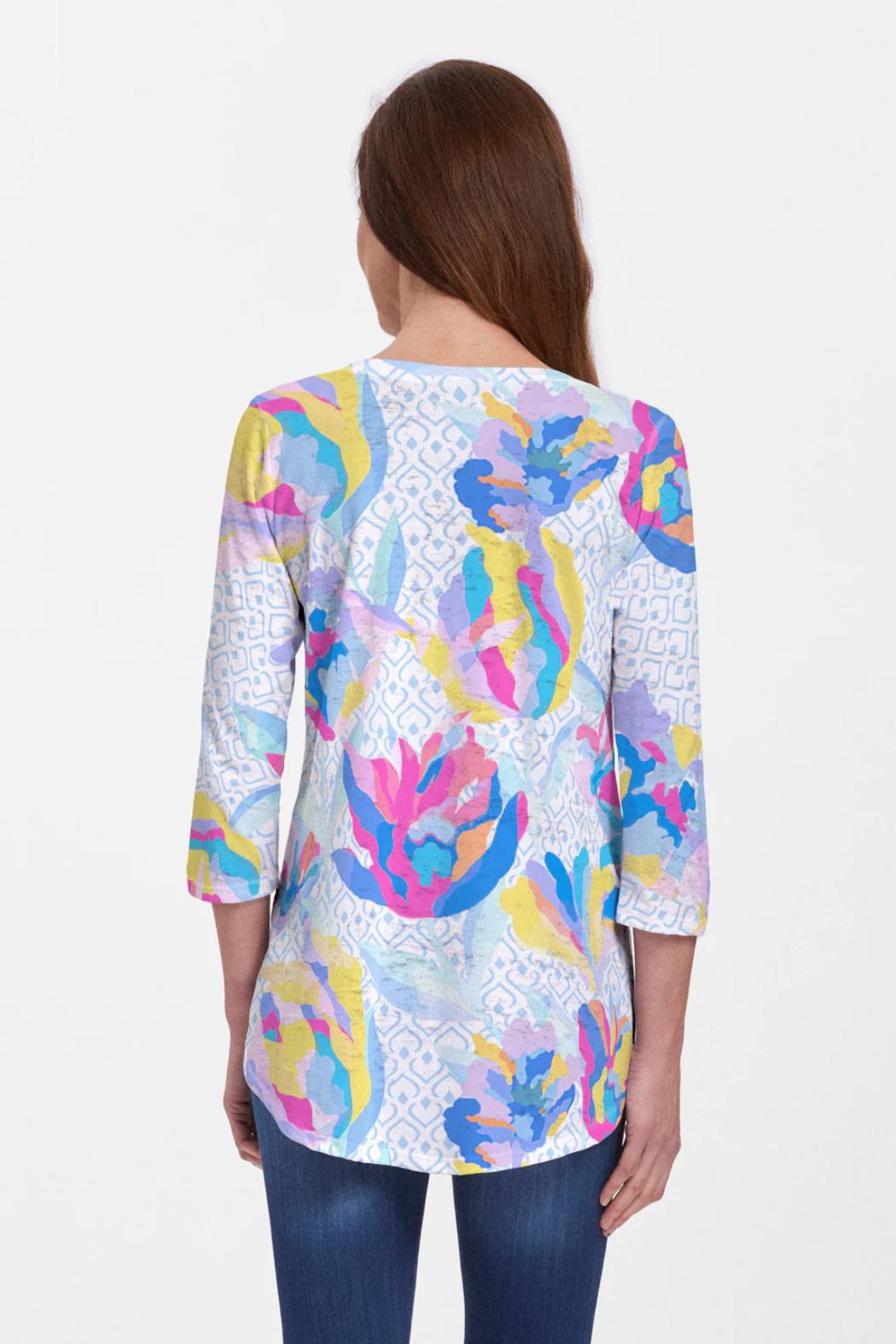 This v-neck tunic in burnout fabric is forever flattering. 3/4 sleeves and a v-neck flow into a full, swinging shirttail hem. -- Your one-of-a-kind garment is created using all-over soft garment sublimation printing. Selected designs are individually printed into your garment. Cotton/Polyester blend.
