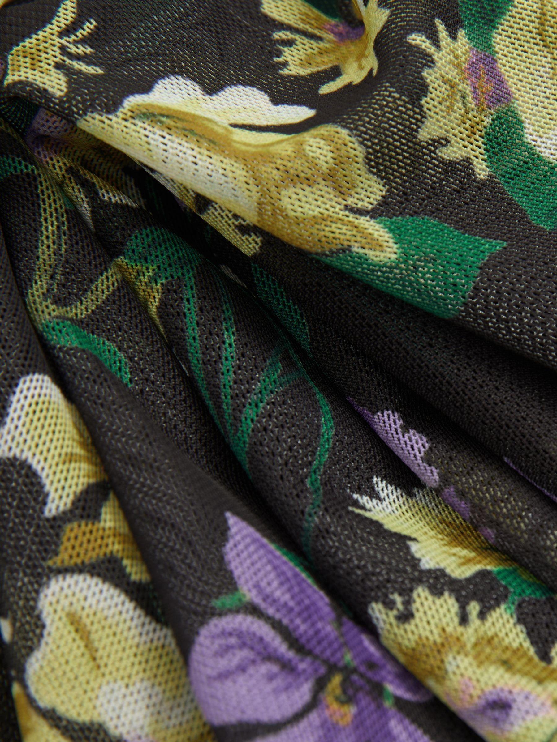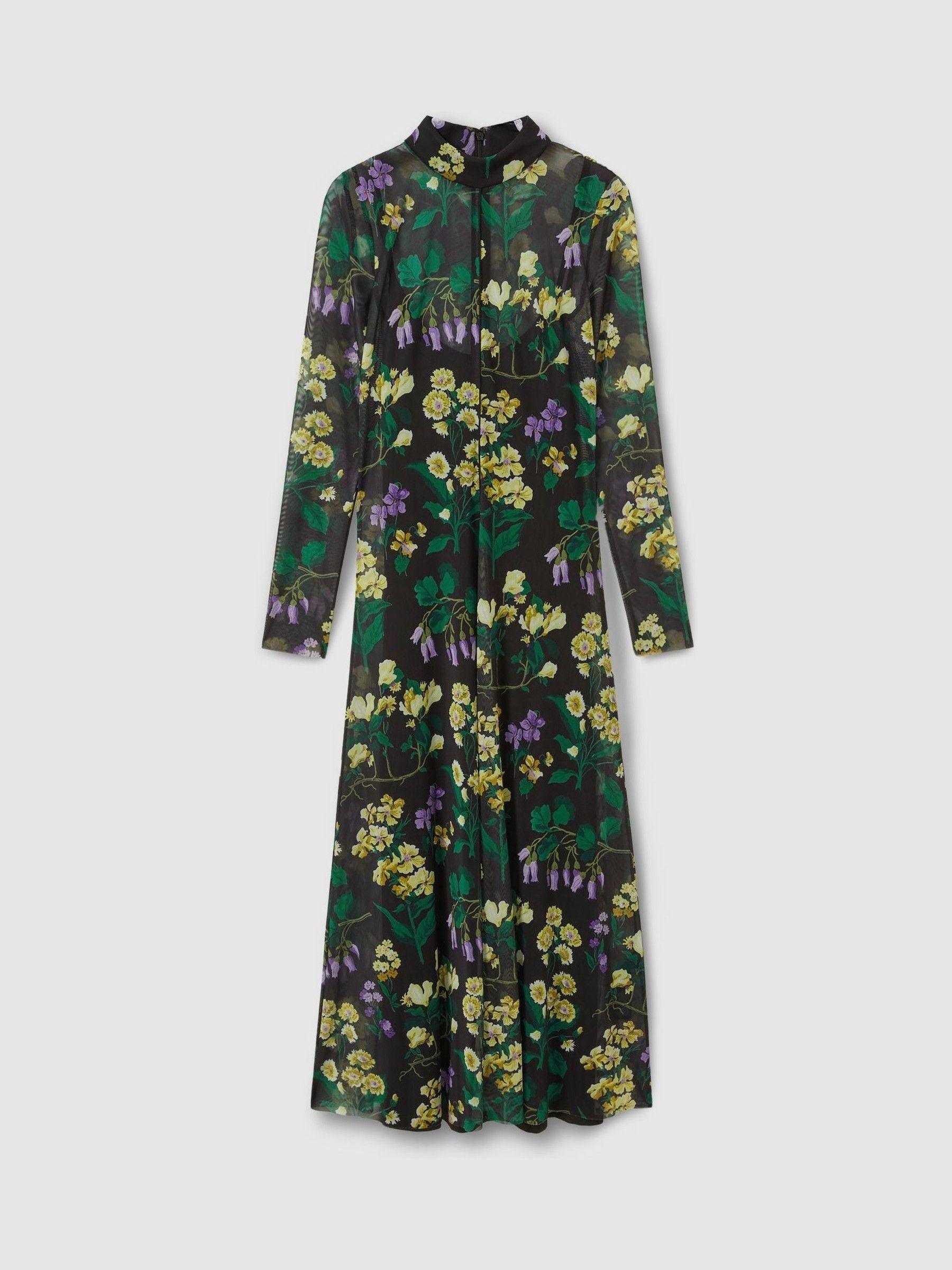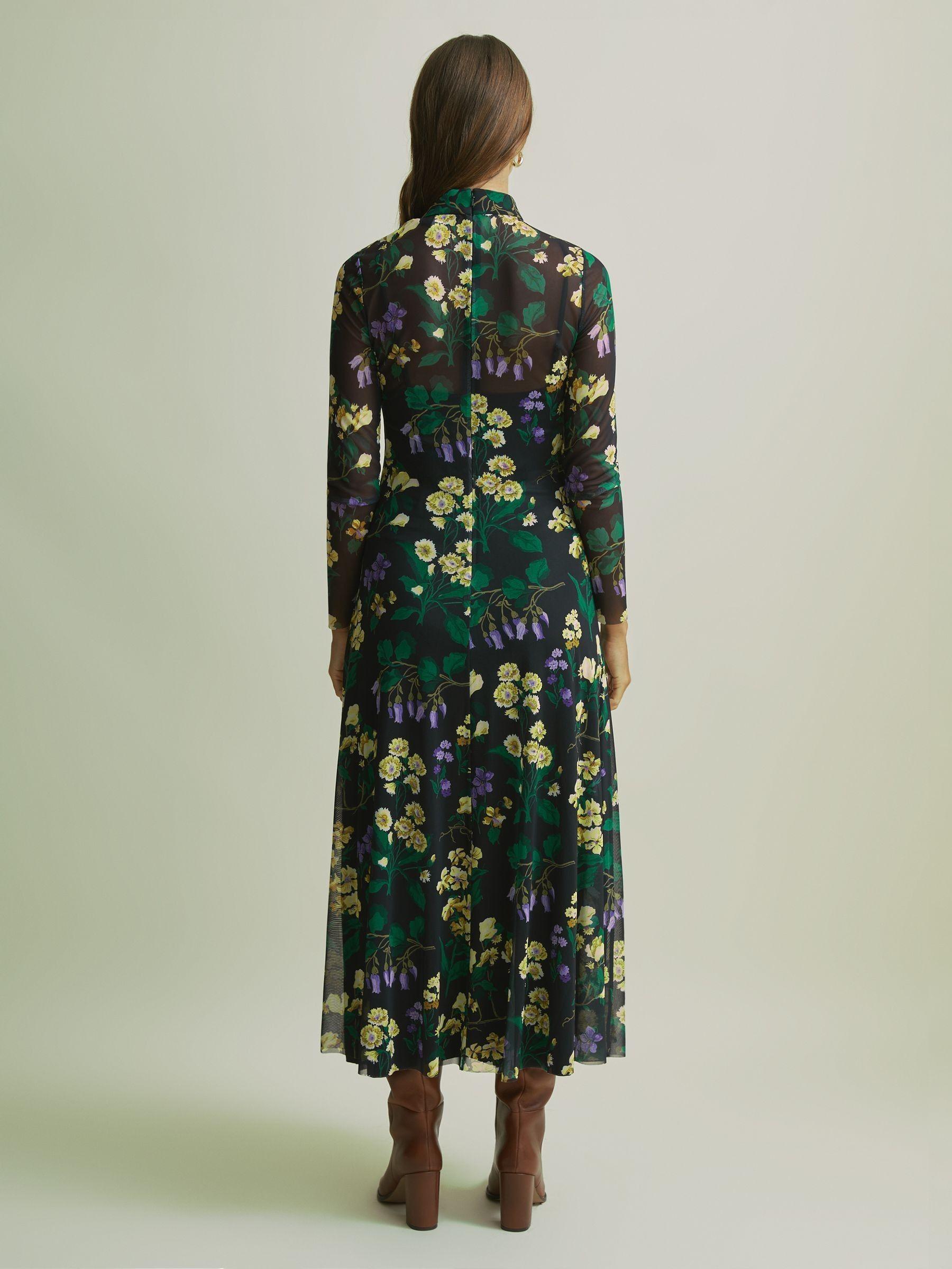 Made from a fluid mesh fabric, this midi dress is fitted through the waist and sleeves. It naturally flares through the length with seam detail finishings. Florere s Floral Symphony print sees painterly peonies intertwine with delicate daisies and periwinkles for a bold, enriched outlook. Mesh fabrication. High neckline. Slim sleeves. Fit-and-flare silhouette. Zip-closure to reverse. Removable cami lining. Midi length. Florere is a modern womenswear brand, that creates a distinct presence in the contemporary premium occasionwear market by inspiring women's wardrobes with bold colours, statement prints, distinctive detailing, and considered versatile designs.