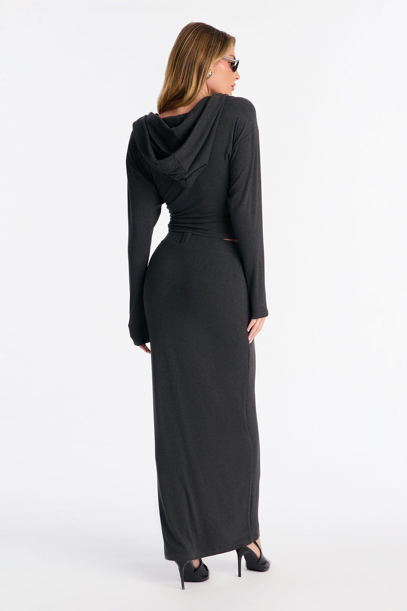 Available In Charcoal And Red. 2 Piece Ensemble Hooded Top And Maxi Skirt Set Stretch Lined Top Elastic Waistband On Skirt Top Self : 65% Rayon 27% Polyester 8% Spandex Lining : 65% Rayon 27% Polyester 8% Spandex Bottom Self : 65% Rayon 27% Polyester 8% Spandex Imported