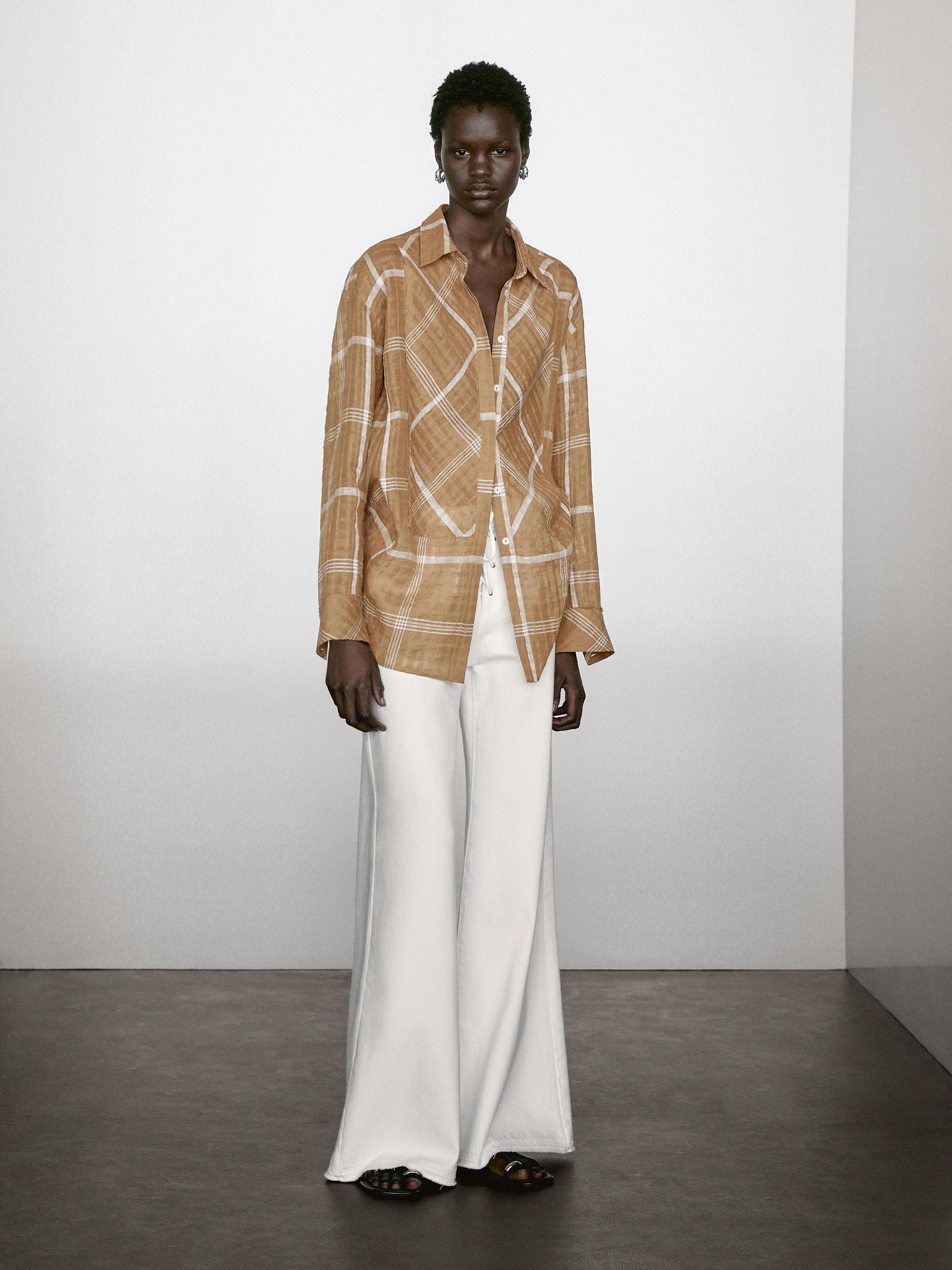 Flowing shirt made of linen blend fabric, Long sleeves with buttoned cuffs, Shirt collar, Frayed finish, Check print, Textured, Wide and relaxed silhouette, not tailored