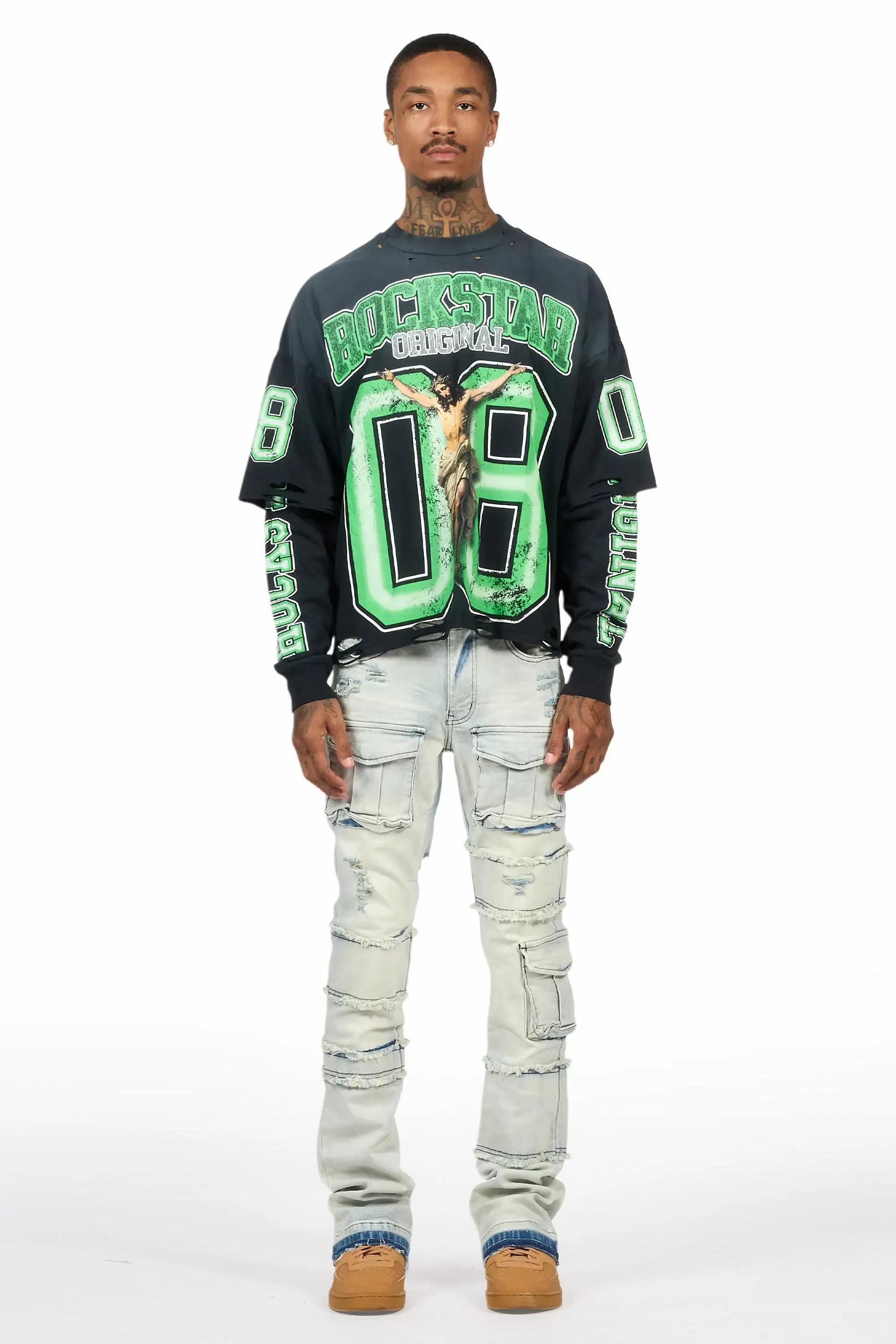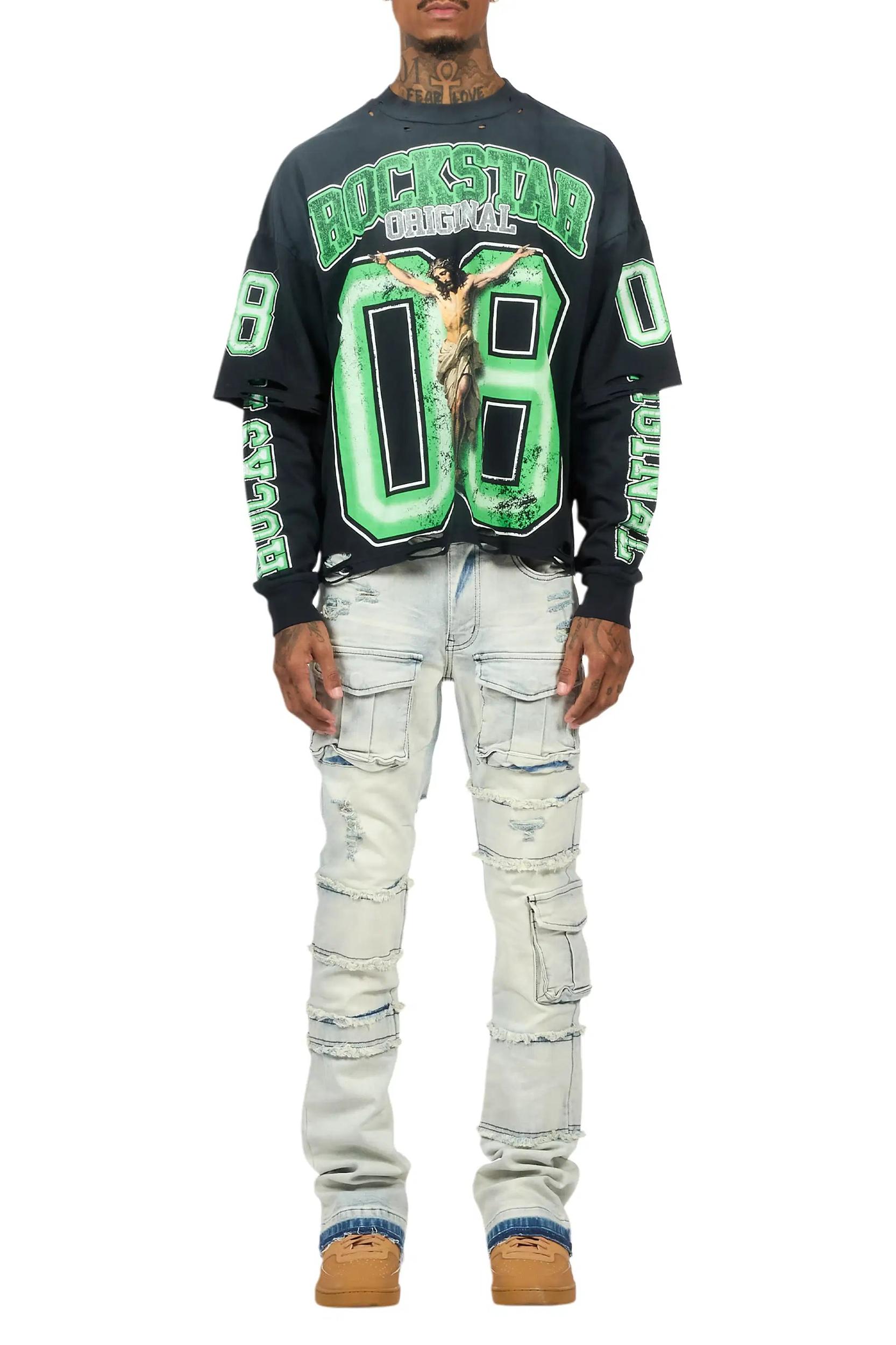 An urban stack denim cargo jean for men in light blue. Designed with organic cotton and extra long legs for an essential streetwear style. Zip fly with button closure Stretch waistband 8-pocket build Utility pockets Distressed detailing Stacked construction Panel stitching Frayed hems Flared leg openings 35.75" seams *NOTE: These jeans are purposefully designed with extra long legs so the fabric properly bunches at the hem, creating the stacked flare style.
