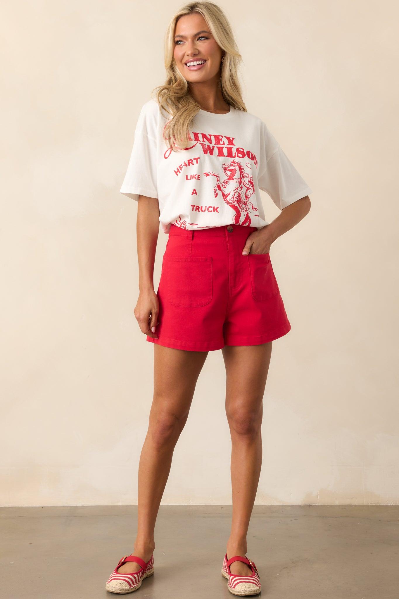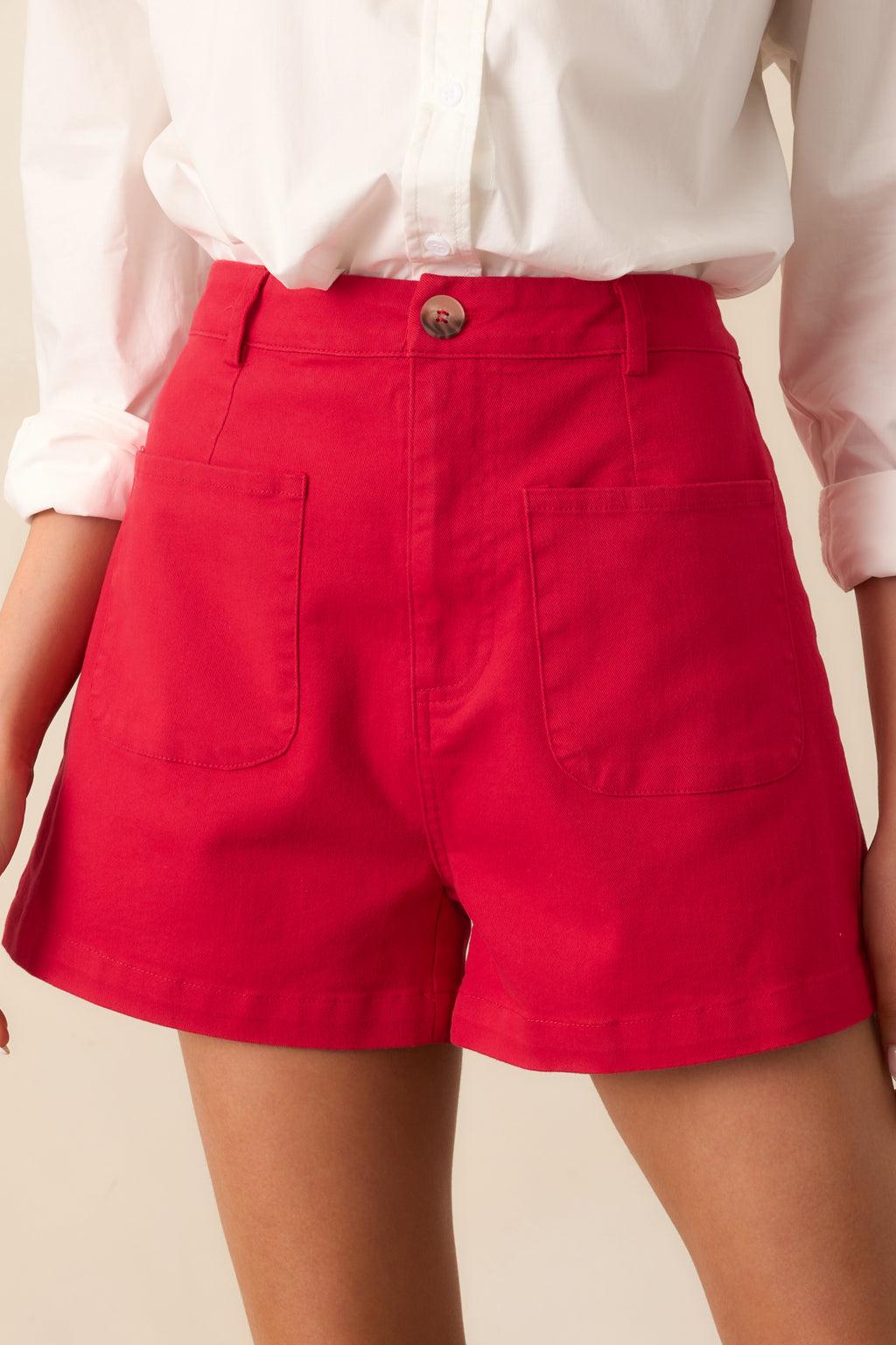 Experience effortless style with the For The Moment Red High Waisted Patch Pocket Shorts. These charming shorts are perfect for a casual day out or a relaxed evening with friends. Their high-waisted design and patch pockets add a touch of sophistication, creating a fresh and versatile look that's ideal for pairing with a variety of tops for a chic yet laid-back vibe. These red shorts feature a high waisted design, a zipper and button closure with a tortoise shell button, functional front patch pockets, functional belt loops, and non-functional back slit pockets. 97% Cotton & 3% Spandex Unlined Hand Wash Cold Manufactured in China Designed in The USA Model is Wearing a Size Small