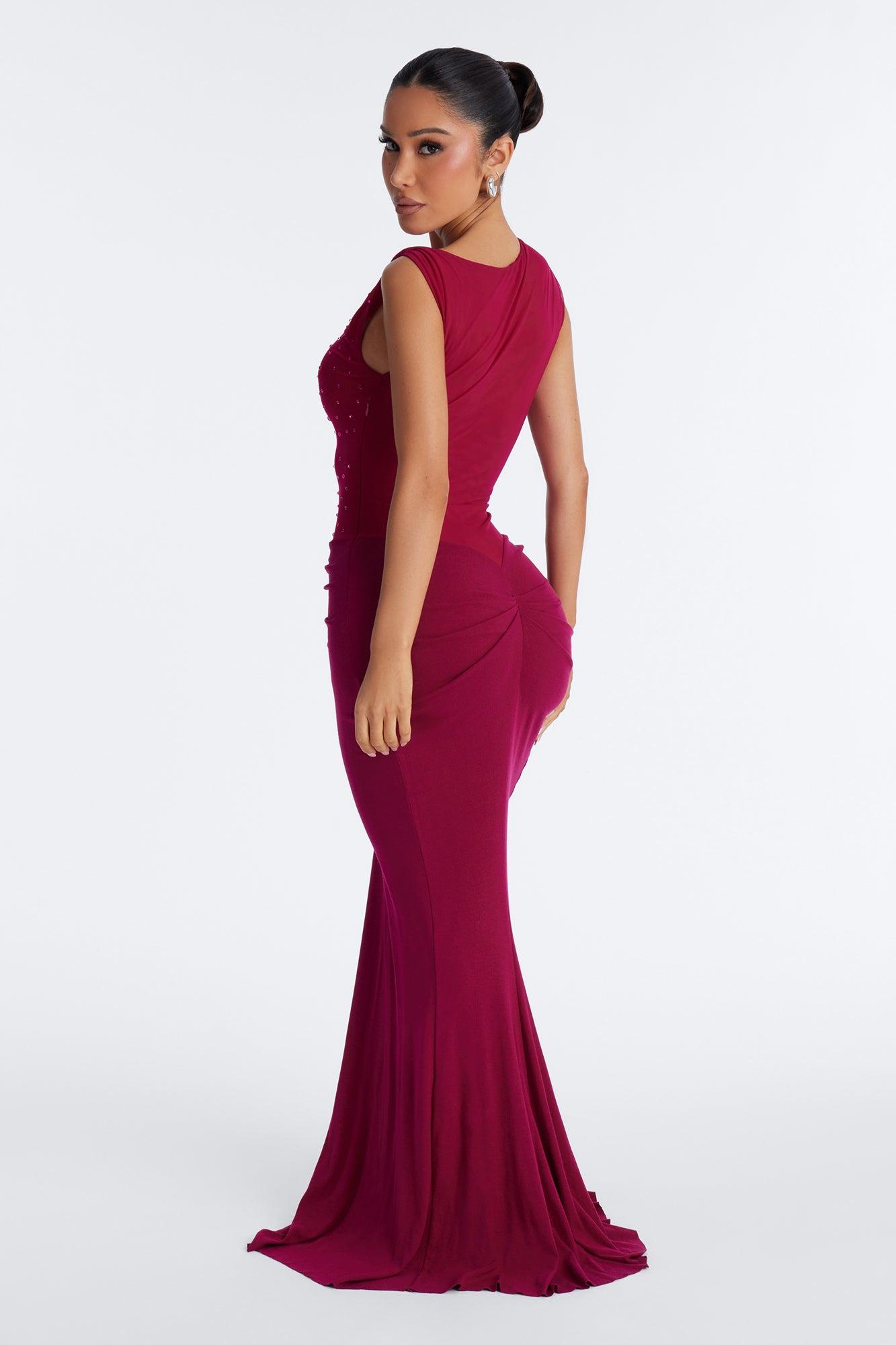 Available In Magenta. Gown Asymmetrical Sleeves High Neckline Rhinestone Embellishments Sheer Drop Waist Ruched Stretch Disclaimer: Due To The Rhinestones Process, Each Garment Is Unique & fall out may happen. Self: 95% Polyester 5%Spandex Contrast: 51% Rayon 27% Polyester 20% Nylon 2%Spandex Imported California Proposition 65WARNING: Cancer and Reproductive Harm - www.P65Warnings.ca.gov.