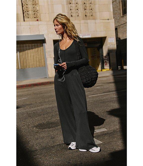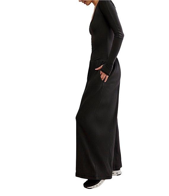 From FP Movement, this onesie features: Knit fabrication Scoop neckline Long sleeves Thumb hole detail Wide leg silhouette Side seam pockets Zip patch pocket in the back Pull-on construction Approx. 28.25" inseam, 11.25" rise Cotton/elastane Machine wash/tumble dry Imported.