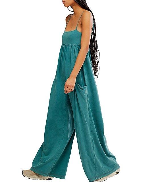 From Free People, this jumpsuit features: Square neckline Sleeveless Adjustable spaghetti straps Empire-style waist Side pockets Back zip pocket Wide leg Pleating detail Relaxed fit Pull-on construction Approx. 30" inseam Cotton/elastane Machine wash Imported.