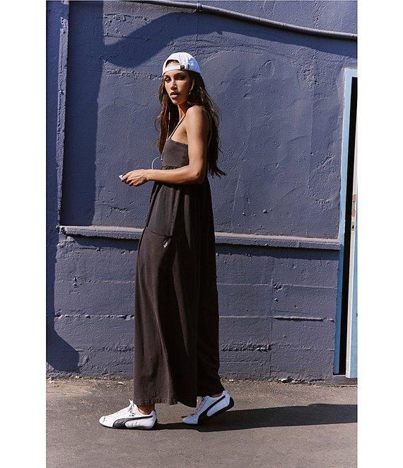From Free People, this jumpsuit features: Square neckline Sleeveless Adjustable spaghetti straps Empire-style waist Side pockets Back zip pocket Wide leg Pleating detail Relaxed fit Pull-on construction Approx. 30" inseam Cotton/elastane Machine wash Imported.