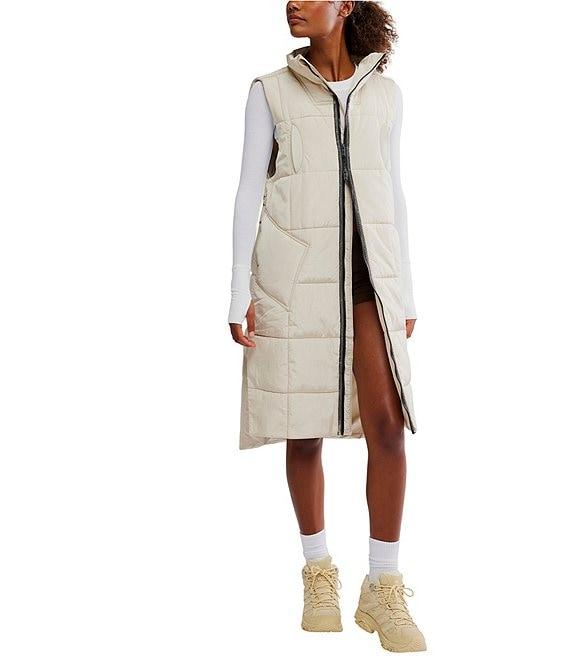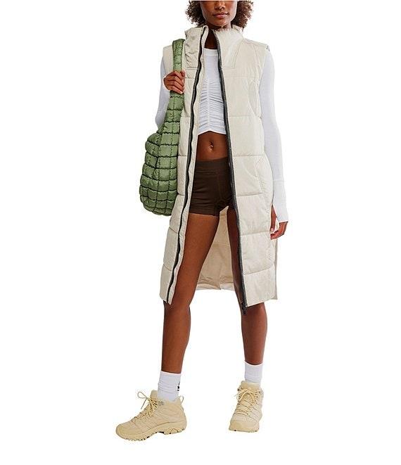 From FP Movement, this vest features: Quilted nylon fabrication Mock neckline Sleeveless Two-way zipper closure Primaloft insulation Water-resistant Fleece-lined hand warmer pockets Large back envelope pocket that also doubles as packable bag with interior snap-button closures Approx. 45" length Self: Nylon Fill: Polyester Machine washable Imported.