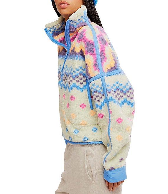 From FP Movement, this pullover features: Fleece fabrication Allover print High neckline Long sleeves Half-zip closure Drop shoulder detail Thick contrast cuff detail Zipped front pockets Adjustable drawcord at bottom hem Approx. 23" length Polyester Machine wash cold Imported.