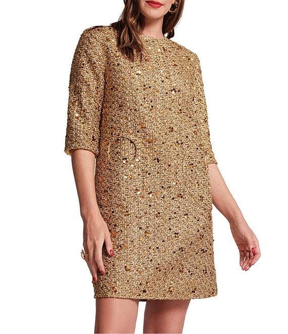 FRANCES VALENTINE Mod Sequin Wool Blend Round Neck 3/4 Sleeve Round Pocket Dress