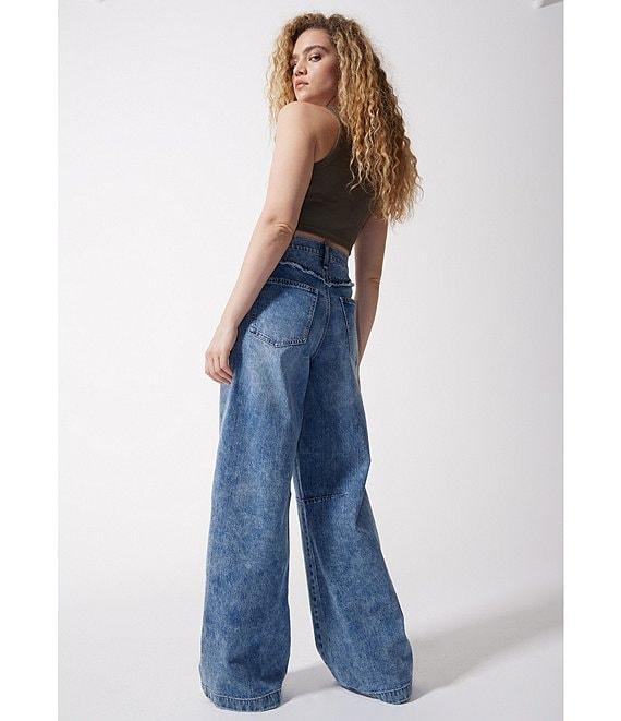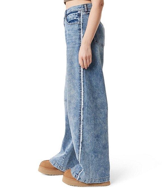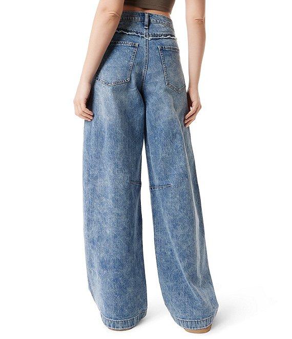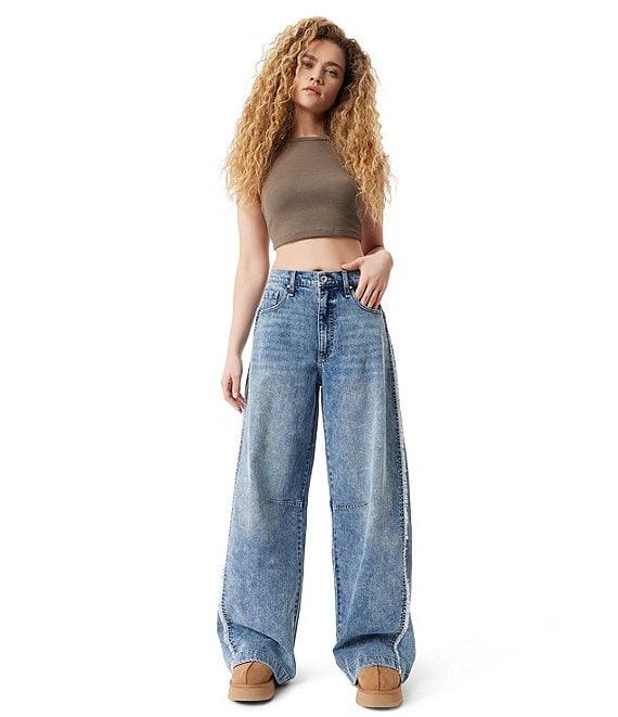 From FRAYED Jeans, these jeans feature: Low rise Front button and zipper closure Belt loops 5-pocket style Baggy barrel Side seam Embroidery on the wearer's right back pocket Trims Approx. 31" inseam Long length Clean hem Wide legs Cotton/polyester/spandex Machine wash/tumble dry Imported.