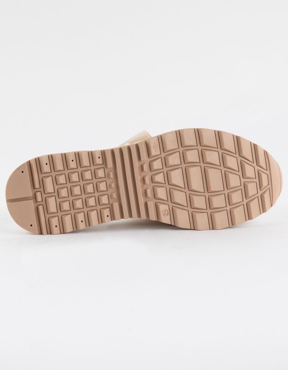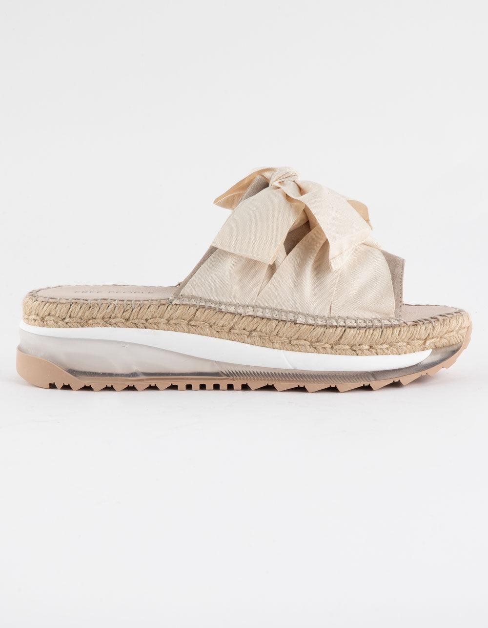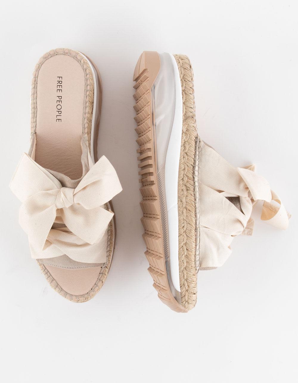 Free People Chapmin Sport Platform Sandals. Reach new heights with these super stacked sandals, featuring espadrille detailing and sweet ribbon laces for an ultra-femme touch. Slip-on style, slingback design, round open toe, suede toe strap, triple-stacked platform sole, espadrille detailing, clear midsole, tread outsole, oversized ribbon laces, self-tie slingback strap. These super unique sandals combine femme and sporty style for a totally stand out pair. Crafted from cotton, leather, and rubber. Imported.