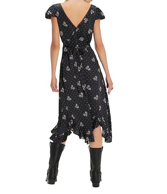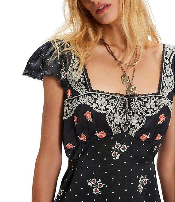 From Free People, this dress features: Satin fabrication Square neckline Short cap sleeves Empire waist Floral/dotted print detail Embroidered details Fabric covered buttons Lace and ruffle detail Plunging back Zip closure Approx. 46.5" length Polyester Machine wash cold Imported.